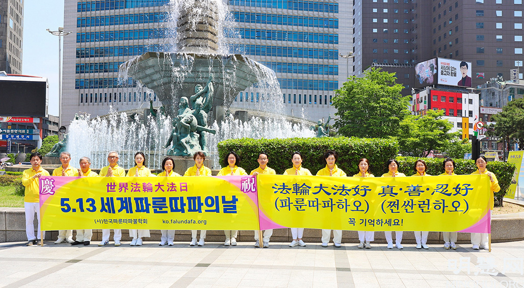 当天中午时分,首尔部分学员们在新世界百货店附近设置了横幅和洪法展板,并拍下了庆祝师父生日的集体照片。在拍摄纪念照片时,喷泉台喷出清爽的喷泉,让人心情愉悦。之后,学员们進行了集体炼功,并向过往的市民派分传单介绍法轮功。当天正值工作日,到了午休时间,不少上班族出来观看了优美的集体炼功场面。