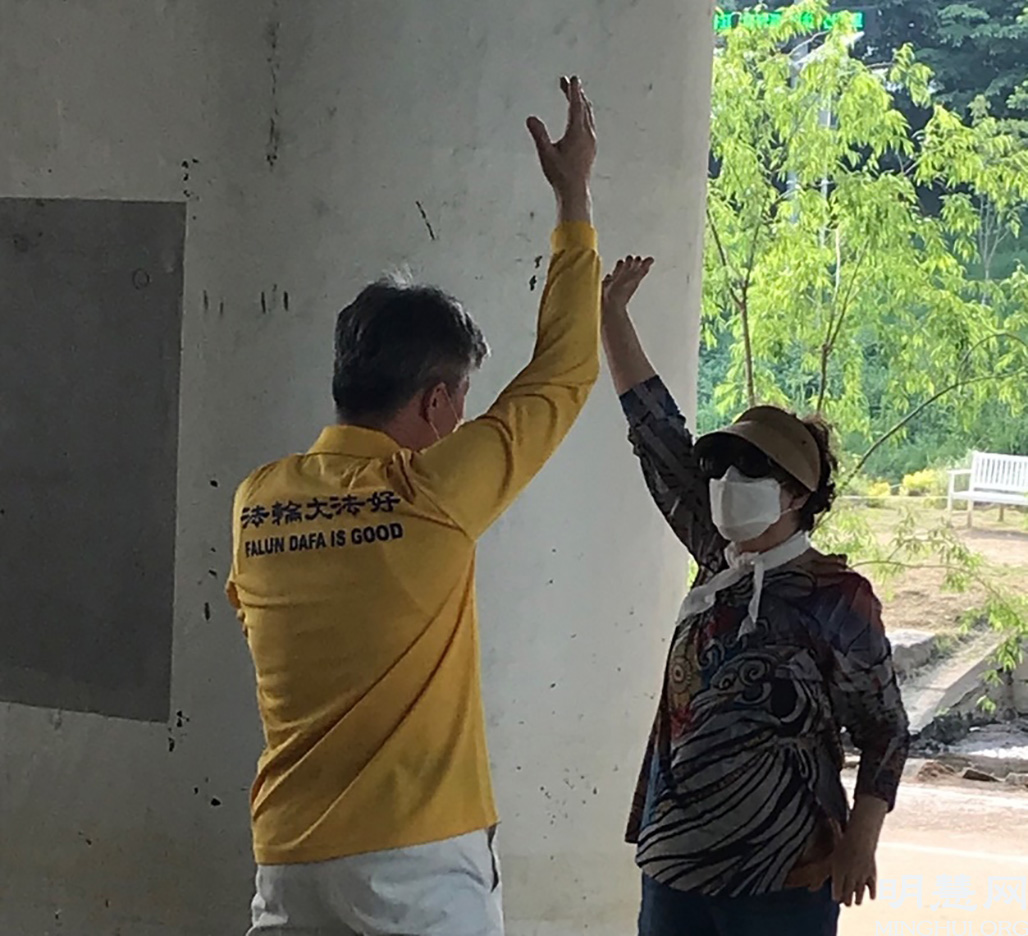图6:朴贞淑(音)女士看到法轮功学员炼功,觉得很神奇。