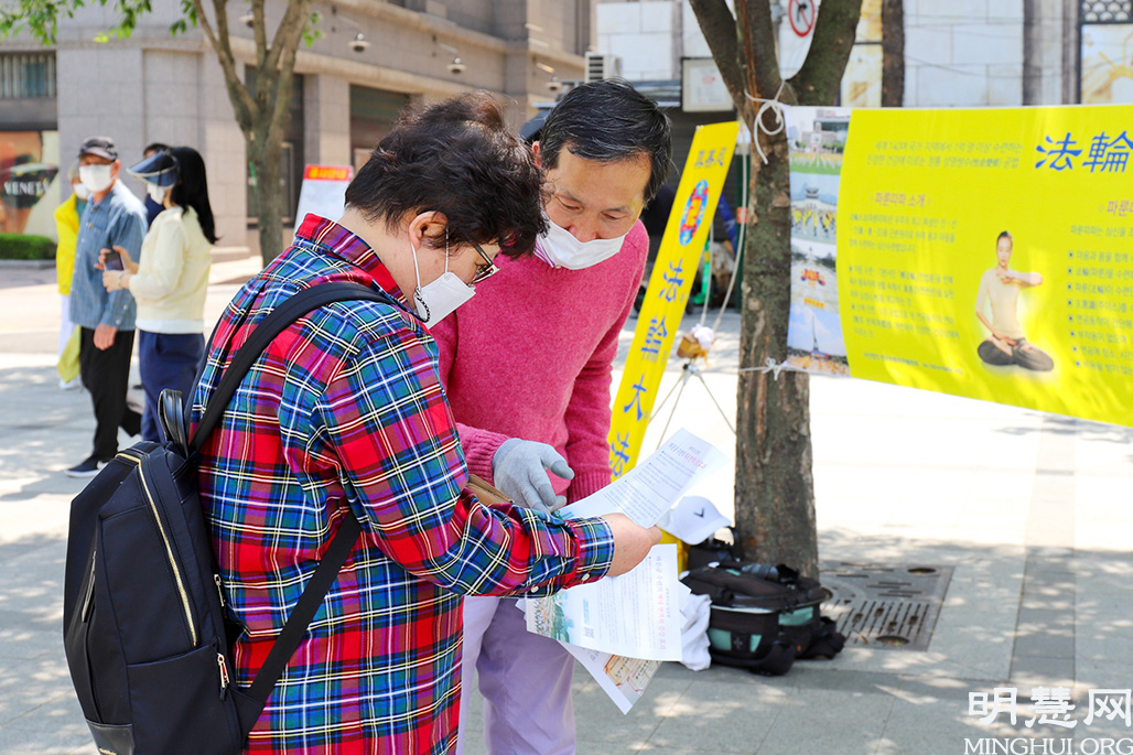 一位釜山市民第一次见到法轮大法,他表示,这是有益健康的修炼,想试一试,并仔细询问如何学习。