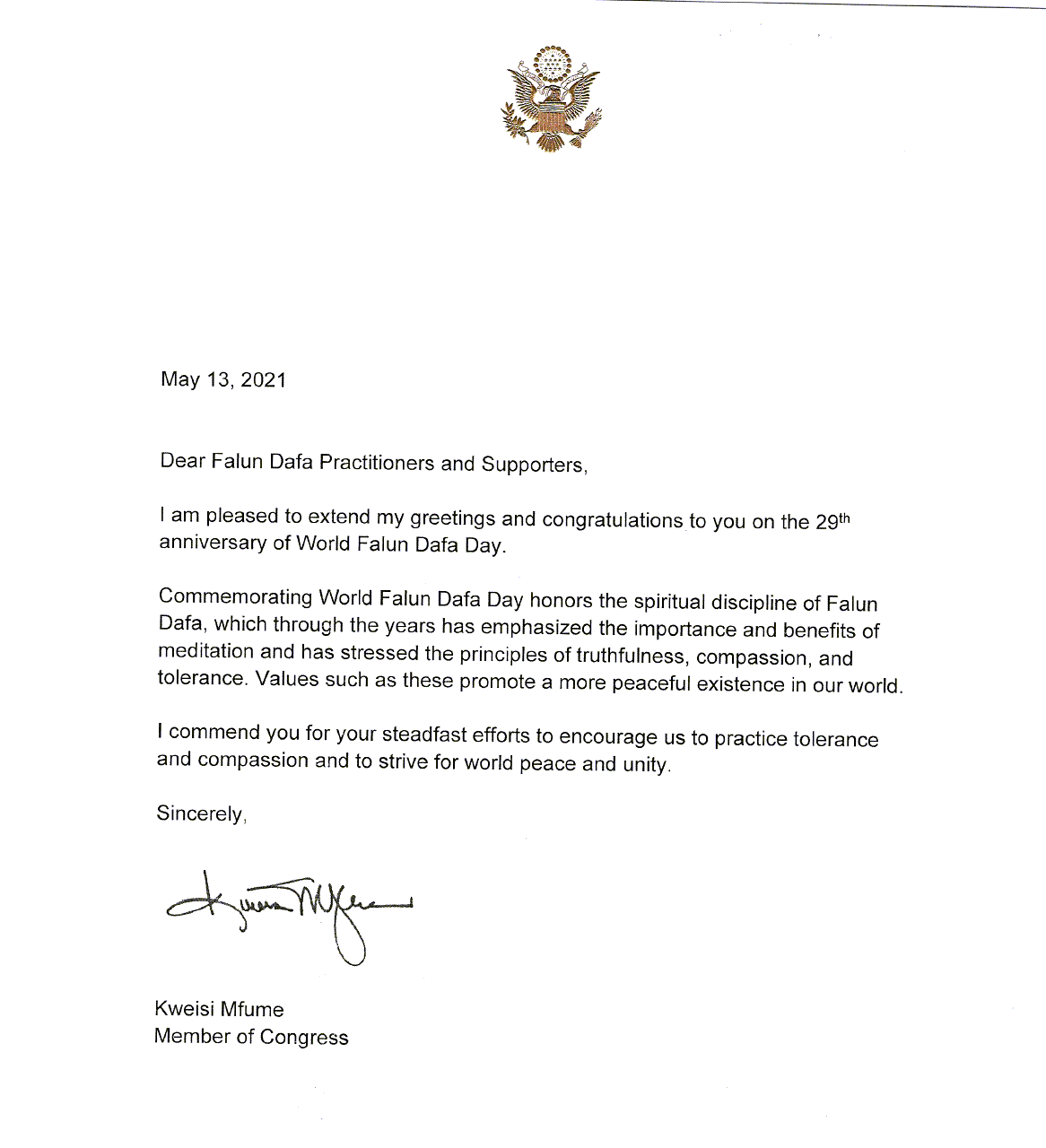 ![]() 图2:美国马里兰州联邦众议员科维斯·穆弗米(Kweisi Mfume)的贺信 |
