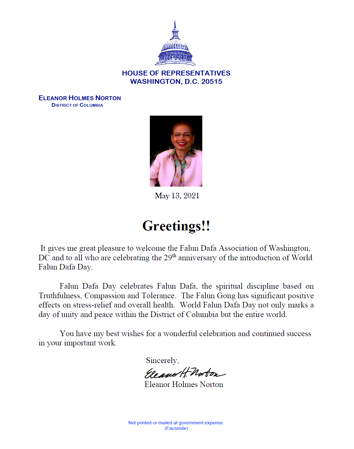 ![]() 图:美国首都华盛顿哥伦比亚特区联邦众议员埃莉诺·霍姆斯·诺顿(Eleanor Holmes Norton)致信祝贺“世界法轮大法日”。 |