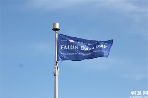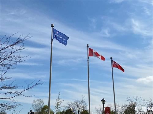 今年法轮功学员还举办了一项特殊活动,一面面印有“世界法轮大法日(FALUN DAFA DAY)真善忍(Truthfulness, Compassion, Tolerance)”的旗帜相继在加拿大的十个城市升起。