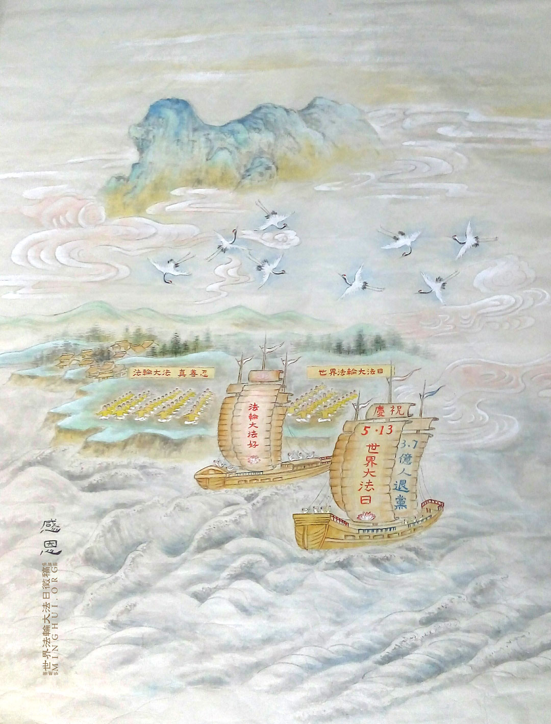 说明:绘画的背景是代表香港精神的塞拉利昂,以此比喻大法弟子不畏苦难、勇猛精进真修的状态。本地有一位同修在师尊的加持下,用慈悲及纯正的心态共劝退了五十七万多人次。借此机会感恩师尊的慈悲救度。