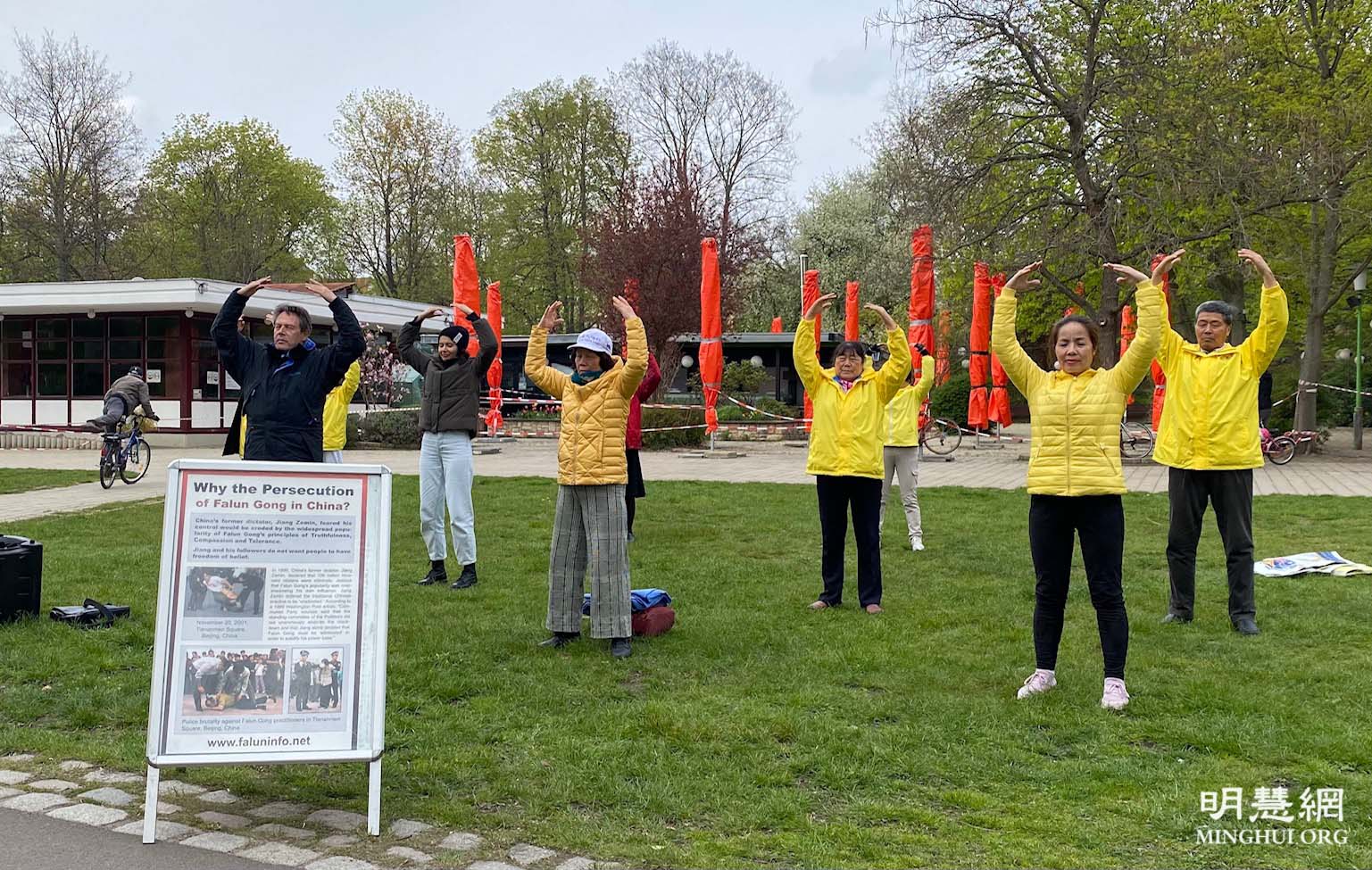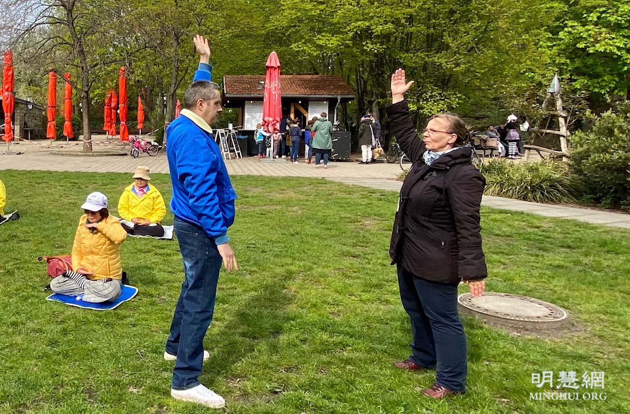 ![]() 图1:二零二一年五月一日法轮功学员在腓特烈斯海恩人民公园演示功法 |