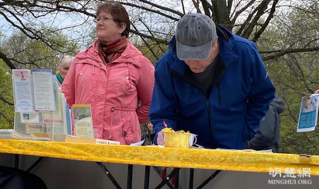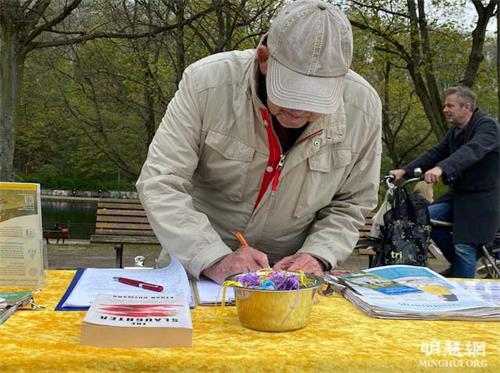 一位老先生表示,他在前东德生活过,对于共产党那一套非常了解。他认为法轮功的真、善、忍和中共的腐败残忍愚蠢正好相反,所以中共不可能容忍它。在文化大革命时期他到过中国,觉得那边一切都古怪。他说,“那里的人从内向外的一切举动反应都是由中共设置好的,我那时候就看出来了。”