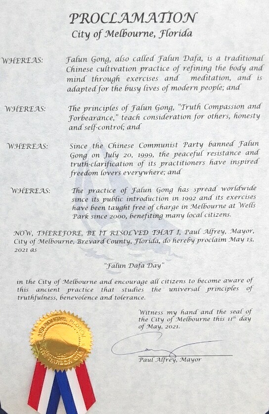 佛州东海岸海滨城市墨尔本市(Melbourne)市长保罗·阿尔弗里(Paul Alfrey)近日宣布2021年5月13日为该市的“法轮大法日”。