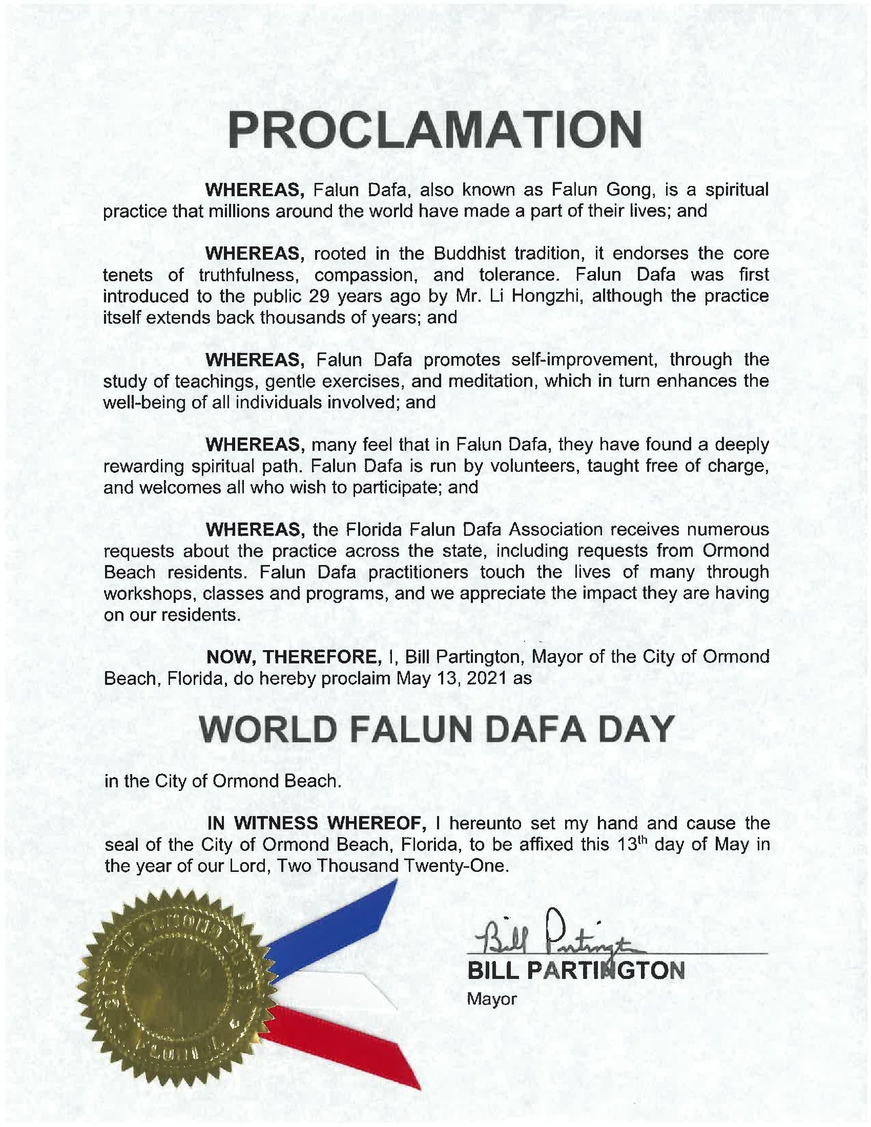 奥蒙德海滩(Ormond Beach)市长比尔·帕丁顿(Bill Partington),宣布2021年5月13日为该市“世界法轮大法日”,感谢法轮大法对居民的积极影响。