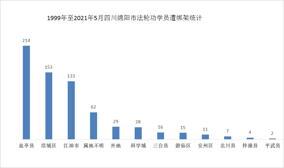 【明慧网二零二一年五月二十四日】(明慧网通讯员四川报道)绵阳市,别称“中国科技城”,是四川省的地级市。据明慧网资料的不完全统计,绵阳市被迫害的法轮功学员有1670人。其中,被迫害致残4人;被药物迫害3人;被非法判刑95人;被非法劳教77人;被非法拘留61人;被强制洗脑396人;被非法关押看守所152人;被绑架的法轮功学员至少有674人(另有4名家属被绑架);被非法抄家163人;被劫财罚款45人,金额至少为1,414,533元人民币(一百四十一万四千五百三十三元)。