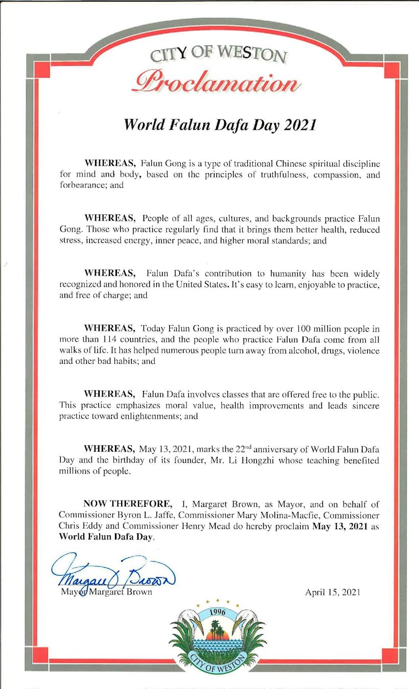 佛罗里达州韦斯顿市(Weston)市长和四位市专员宣布五月十三日为法轮大法日,褒奖状赞扬法轮功提升人们的道德标准,帮助很多人远离了酗酒、毒品、暴力以及其它不良生活习惯。褒奖赞颂创始人李洪志先生的教导使上亿人受益。
