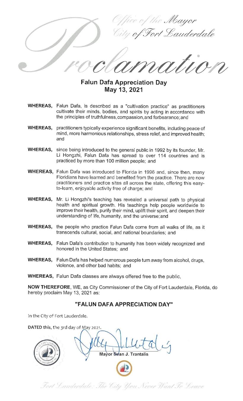 鉴于,法轮大法于1996年传到佛罗里达。自此,许多佛罗里达居民学炼了此功法,并且因此而受益。现在修炼者和炼功点遍布佛罗里达州各地,免费教人学炼这种简单易学、令人愉悦的功法;