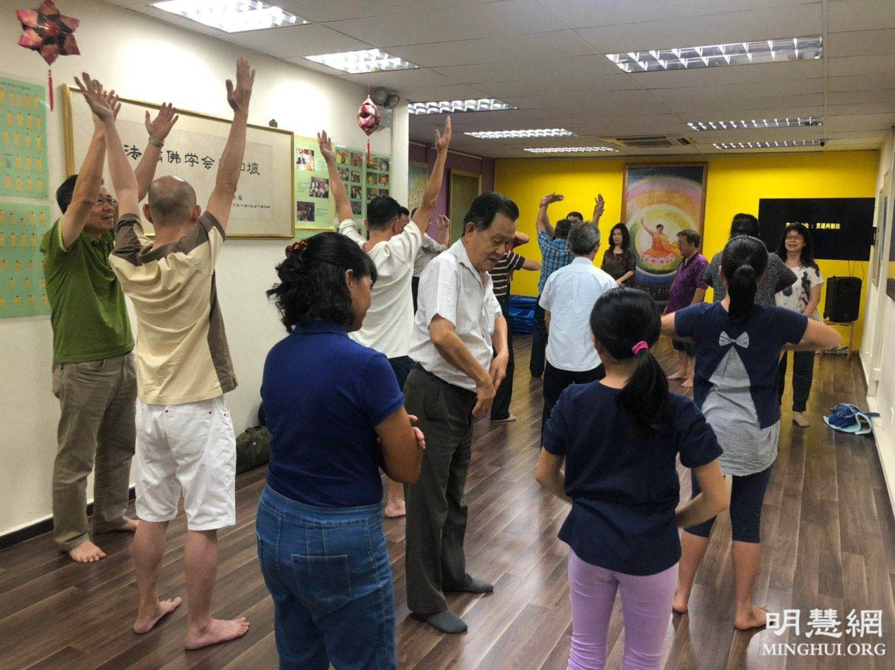 ![]() 图2:二零一九年十二月二十八日至二零二零年一月五日,新加坡法轮功学员举办九天免费教功班。图为老学员在教新学员炼功。 |