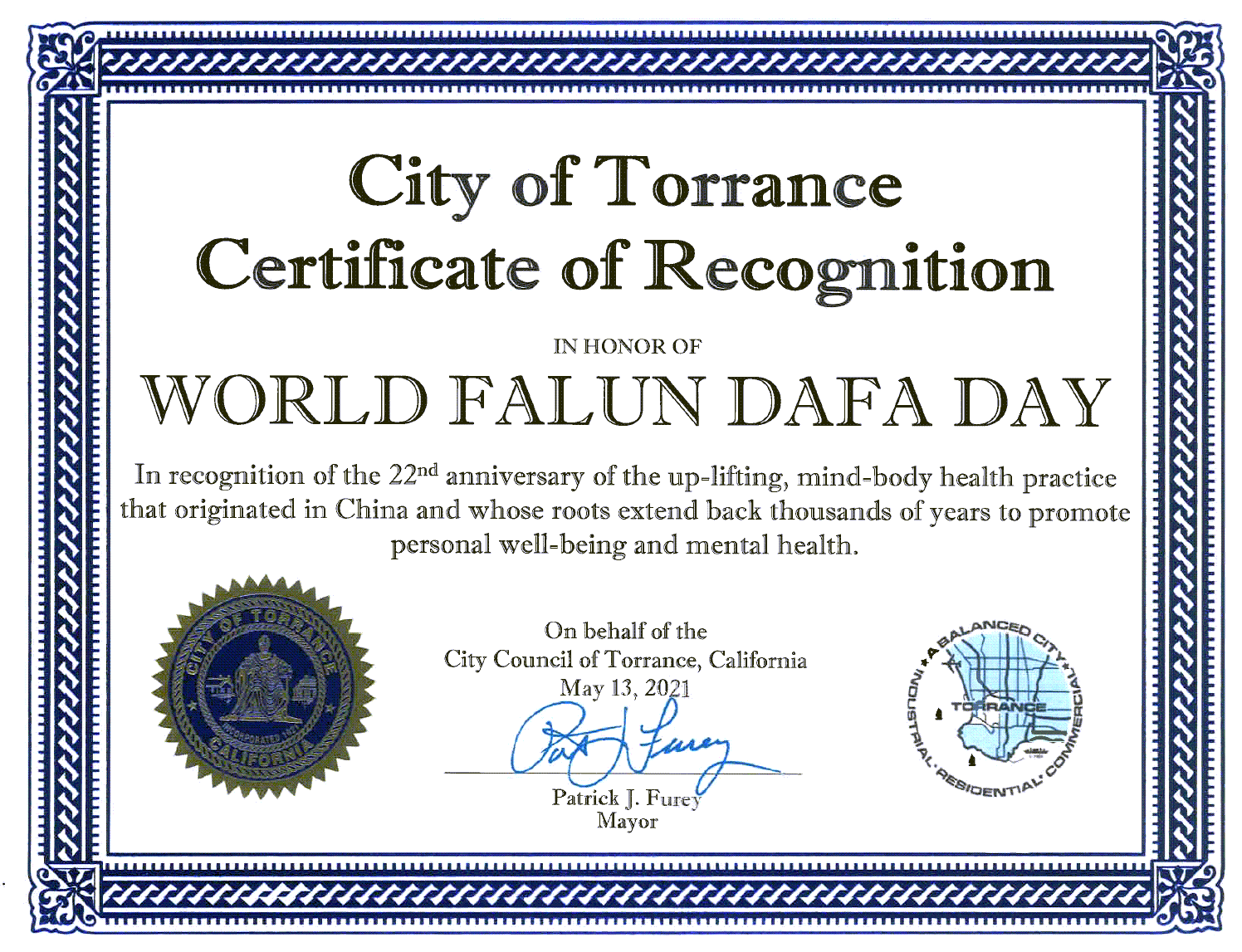 洛杉矶地区南部的托拉斯市(Torrance)市长帕特里克·弗瑞(Patrick Furey)颁发嘉奖状,表彰这一根植于中国数千年传统文化的提升人身心的功法。