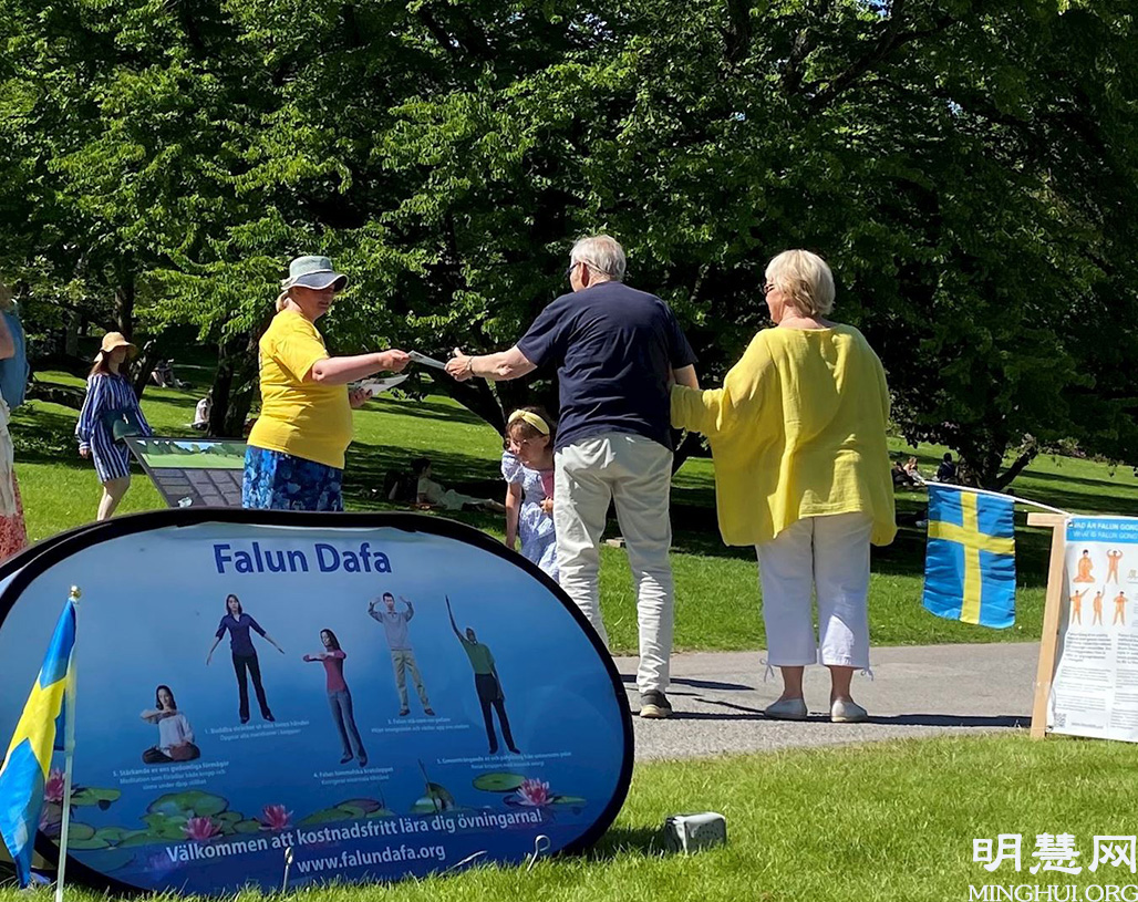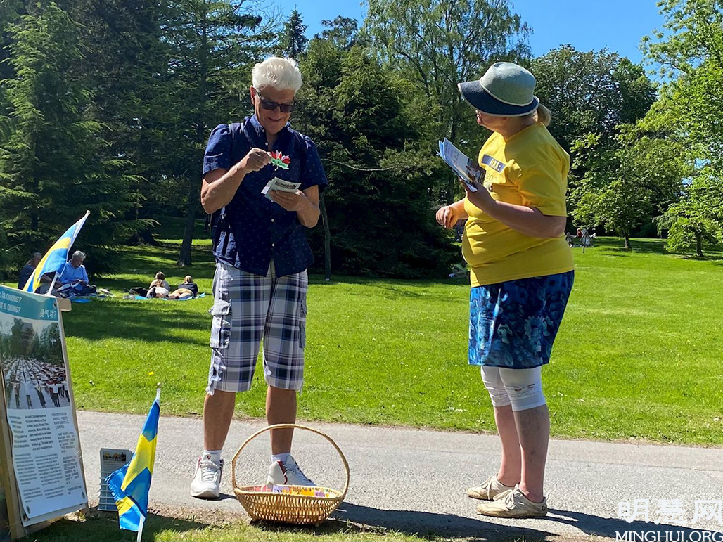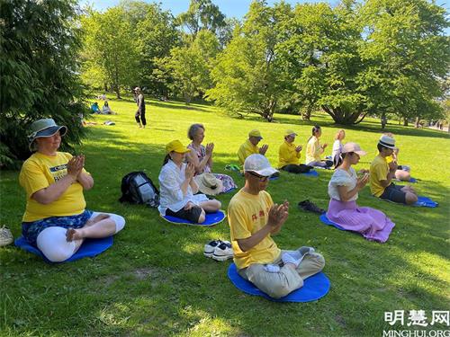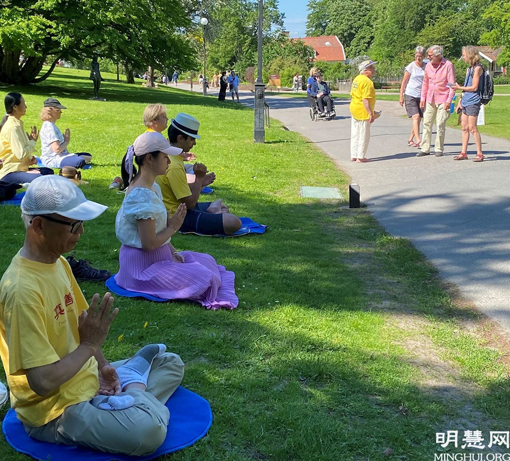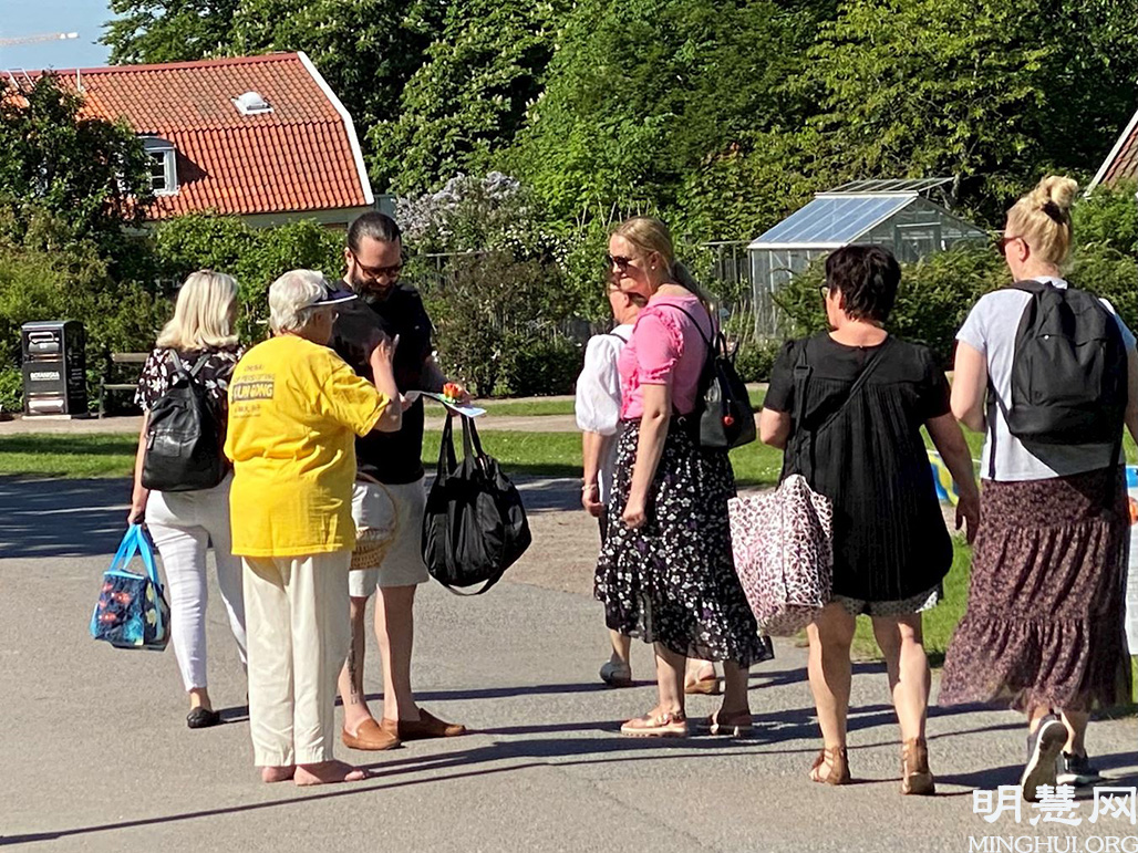 二零二一年六月六日,风和日丽,在哥德堡的植物公园散步和野餐的人们被法轮功学员的炼功场面所吸引。