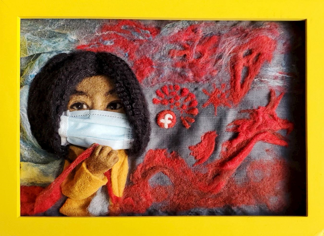 因中共隐瞒,造成疫情蔓延、全球遭殃。“我们一直在说防疫的重要性,但世人若无法看清邪恶红龙(中共政权),无法抓住根源,我们无法捍卫自己的生存之道。”晓臻思考身为一名羊毛毡艺术创作者能做些什么?近日,晓臻发表了一幅羊毛毡画《我想说话……》,作品呈现地球上的人类,抓着红色恶龙尾巴,提醒“在这最后一刻我们要抓住源头,不要让红色势力再蔓延世界”。