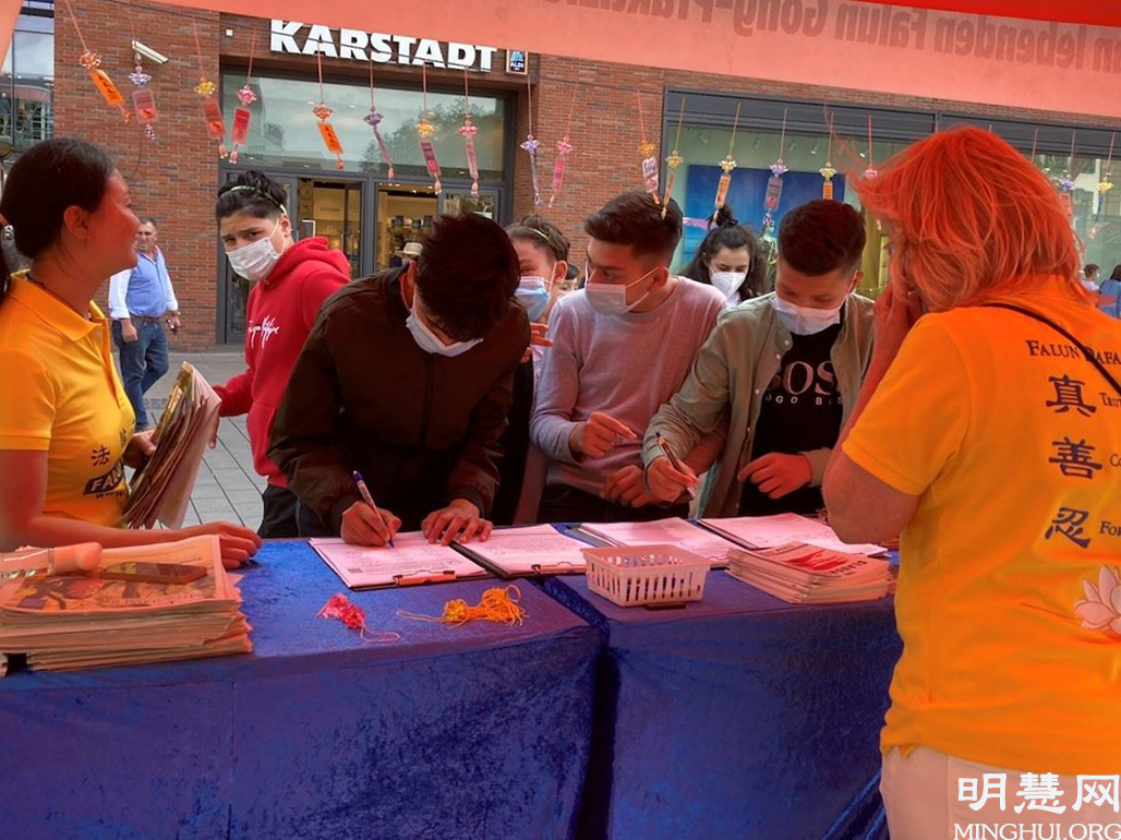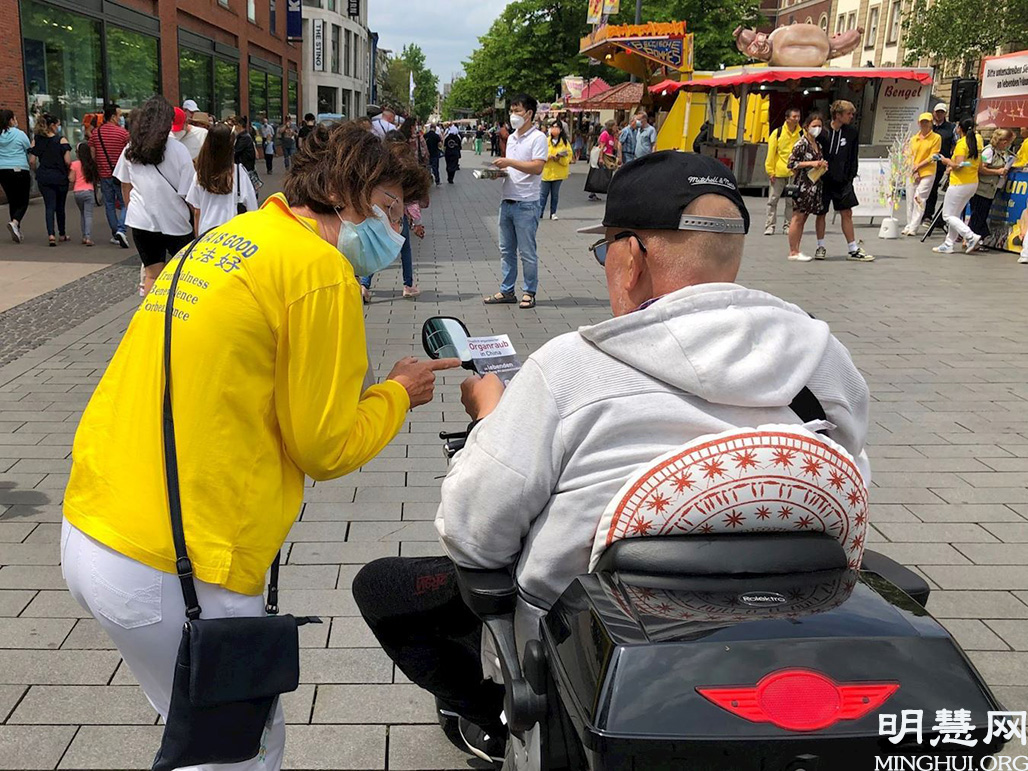 【明慧网二零二一年六月十四日】二零二一年六月十二日,法轮功学员在德国杜伊斯堡(Duisburg)市中心演示五套功法,同时演讲介绍法轮功,并穿插腰鼓表演,吸引了很多路人驻足观看、聆听。有的当场学炼动作,有的主动询问集体炼功点的讯息,还有人知道中共迫害法轮功后,当即签名支持法轮功学员反迫害。