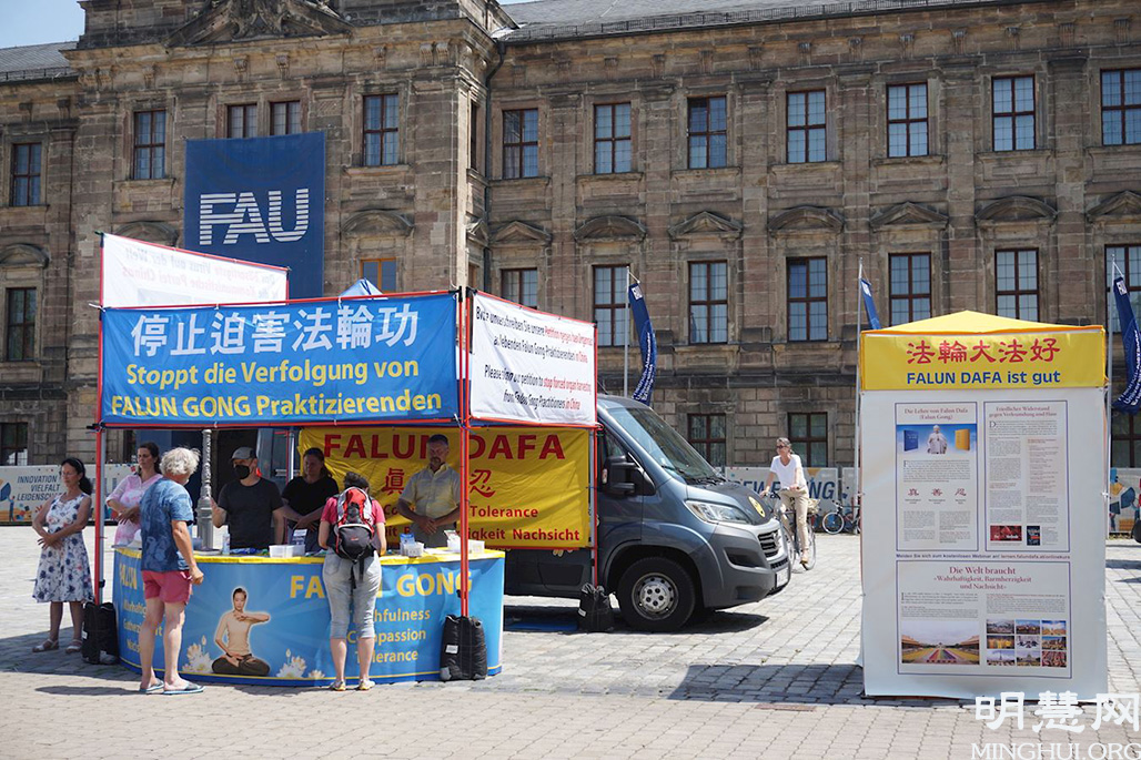 这一天阳光很足,气温高达35摄氏度,爱尔朗根市的王宫广场位于市中心布满了集市摊位,人流络绎不绝。很多人在法轮功的真相展点驻足,阅读展板上的内容。有的人直接来展位说自己知道在中国发生的对法轮功的迫害,惊讶于迫害仍然在进行,并要求签名支持。
