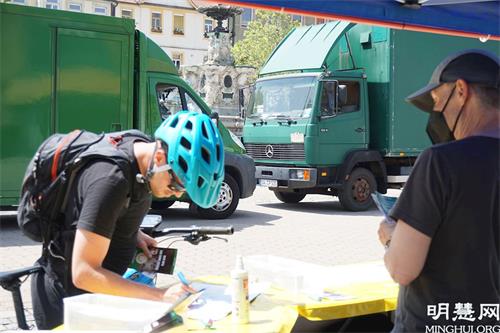 一位德国男士到展点前,在正午的太阳直射下与学员交谈良久。他说自己是一位维基百科的作者,早就关注法轮功,对法轮大法及发生在中国的迫害有一定了解。他自己曾经在维基上写过一篇关于法轮大法的正面文章。这次与法轮功的巧遇让他感到惊喜,他向学员仔细地询问了一些问题,最后在停止活摘法轮功学员器官等两张征签表上都签了名。