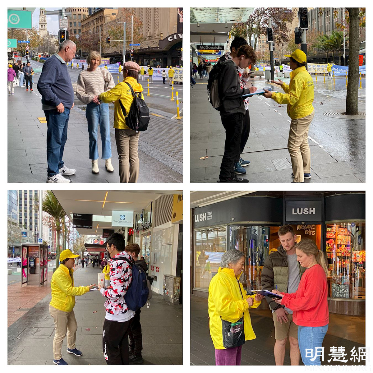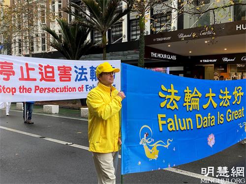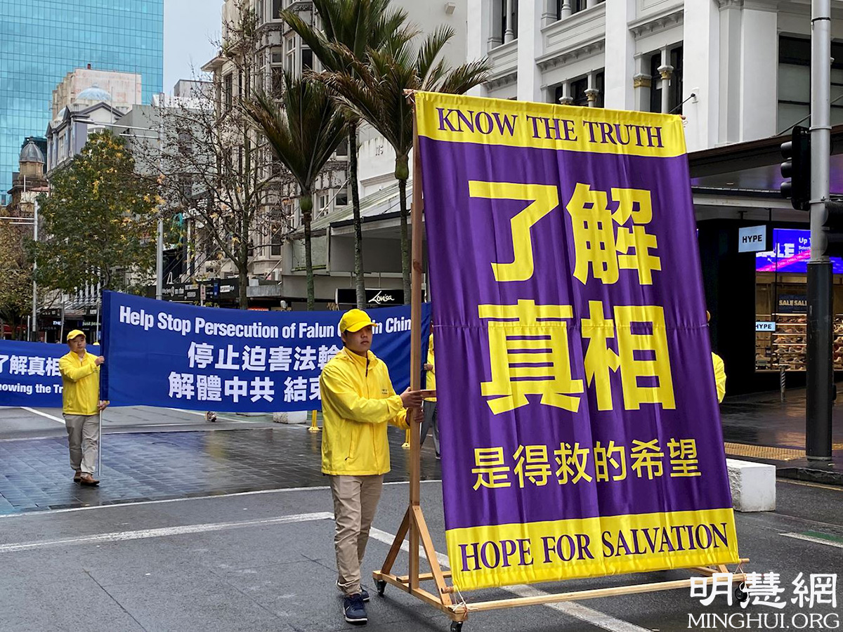 游行从市中心的伊丽莎白广场开始,一直到奥提雅(Aotea)广场,这是奥克兰最繁华的商业街,街道两边高楼耸立,行人不绝。游行现场警车开道,首先映入人们眼帘的是法轮功学员组成的天国乐团,蓝白相间的服饰、雄壮的乐曲,立即吸引了人们的注目。