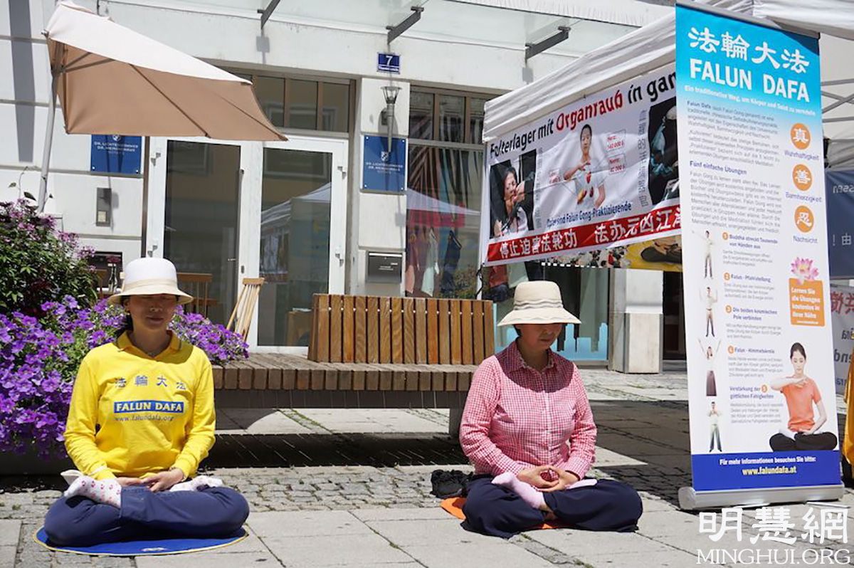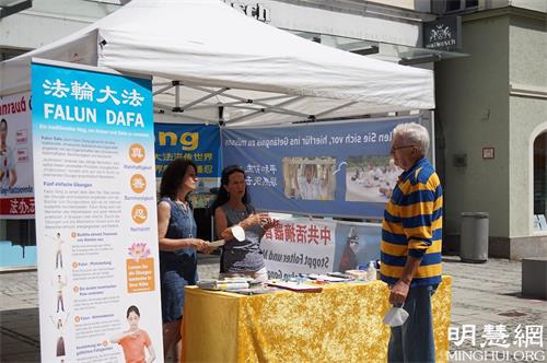这一天阳光明媚,法轮功学员的真相展点设立在英戈尔施塔特市中心步行区的特蕾莎大街,这里商店、餐馆、咖啡店密集,经过真相展点的行人络绎不绝。很多人驻足,与法轮功学员交谈,了解真相。