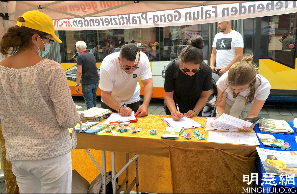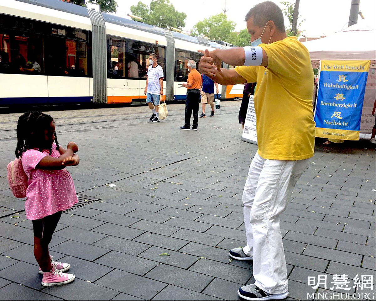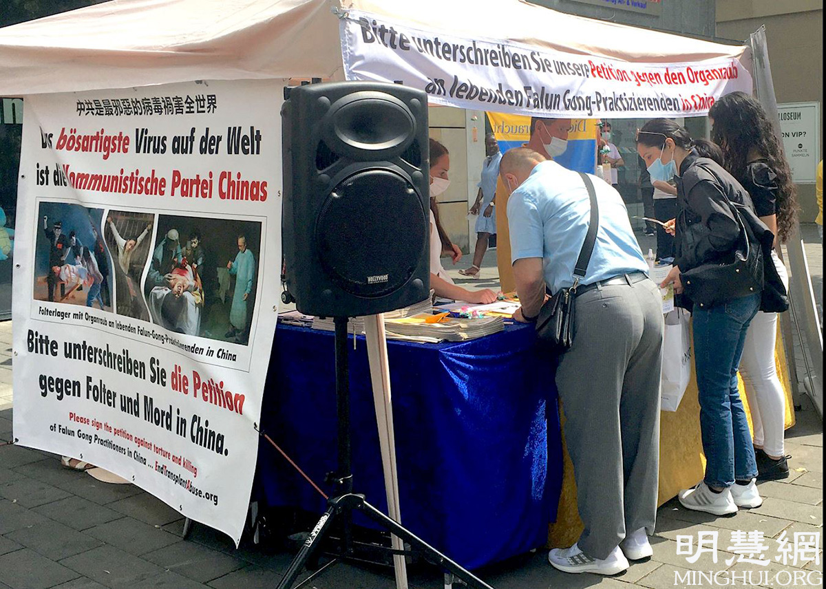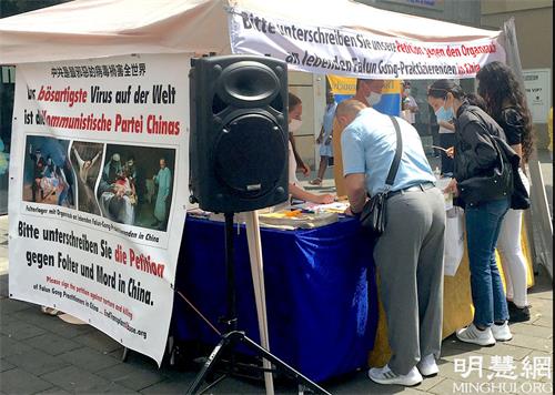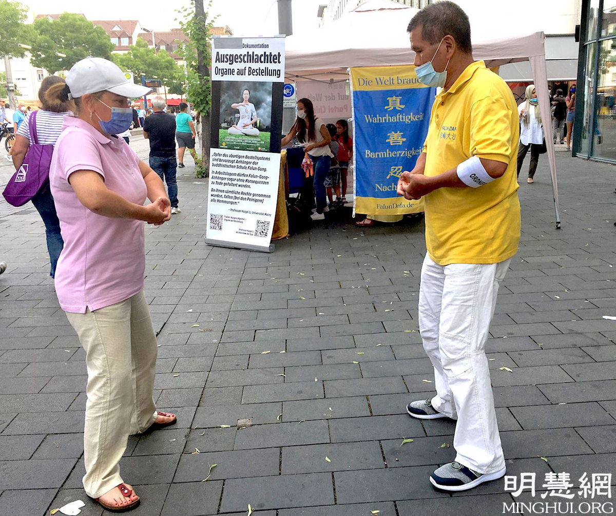 法轮功学员当天的信息展点位于集市广场(Marktplatz)对面的步行街。疫情缓解,步行街又恢复了以往的热闹。学员们的功法演示吸引了不少过路行人驻足观看。