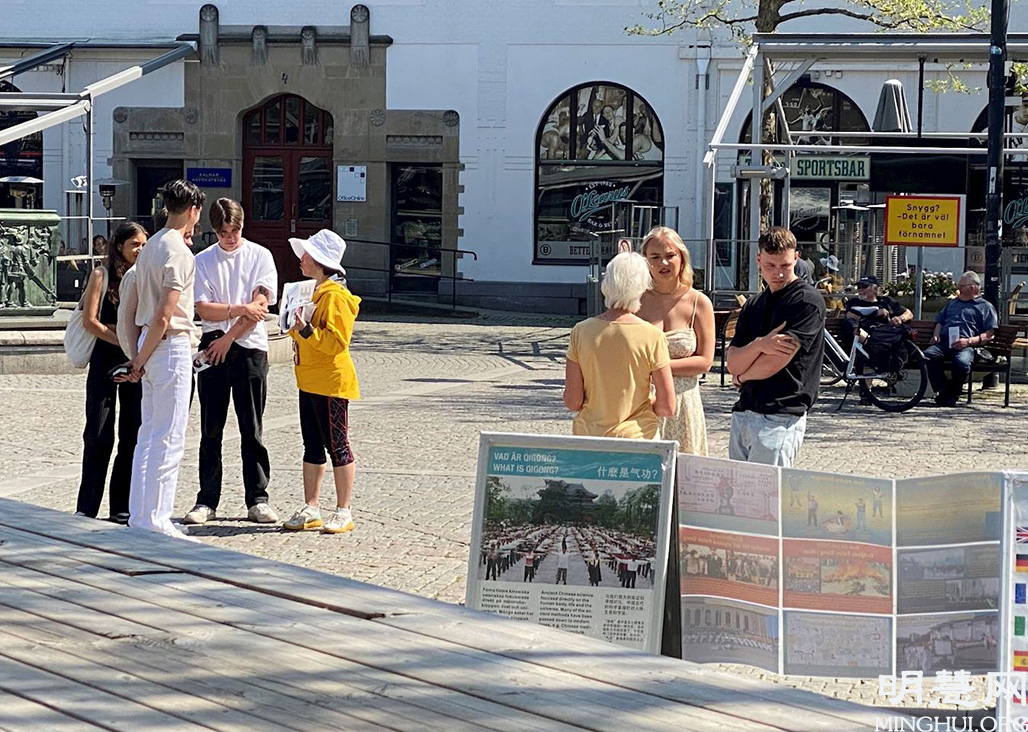 安德士(Anders)来到拉姆广场与法轮功学员交谈。他是一位当地报纸的资深记者。他问学员:什么是法轮功?以及中共为什么迫害法轮功?