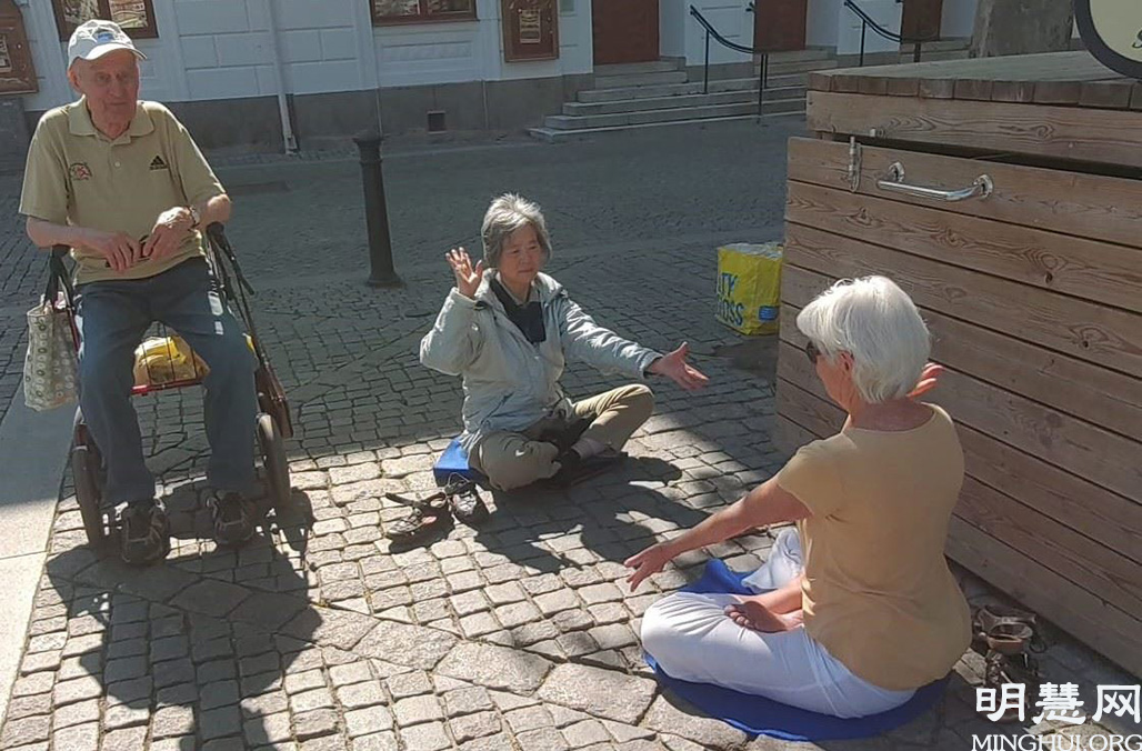 ![]() 图1:法轮功学员在卡尔玛市(Kalmar)拉姆广场(Larmtorget)的舞台上集体炼功 |