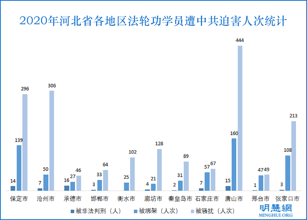 ![]() 图:2020年河北省各地区法轮功学员遭中共迫害人次统计 |