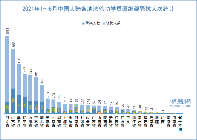 据明慧网信息统计,二零二一年上半年,6179名法轮功学员被中共骚扰。迫害最严重地区是:河北省1333人,山东省795人,黑龙江635人,四川省513人,吉林省481人,辽宁省467人,湖北省329人,天津市213人。