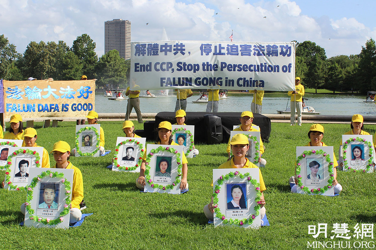 二零二一年七月十日,休士顿法轮功学员在荷门公园(Hermann Park)举办反迫害活动。下午四点集会开始,学员在湖畔搭配演讲台,并展开“解体中共 停止迫害法轮功”、“法轮大法好”等真相横幅。期间部分学员们手持花圈,上面有因修炼被迫害致死学员的遗像,让来往市民了解中共邪恶本质,征签支持法轮功。