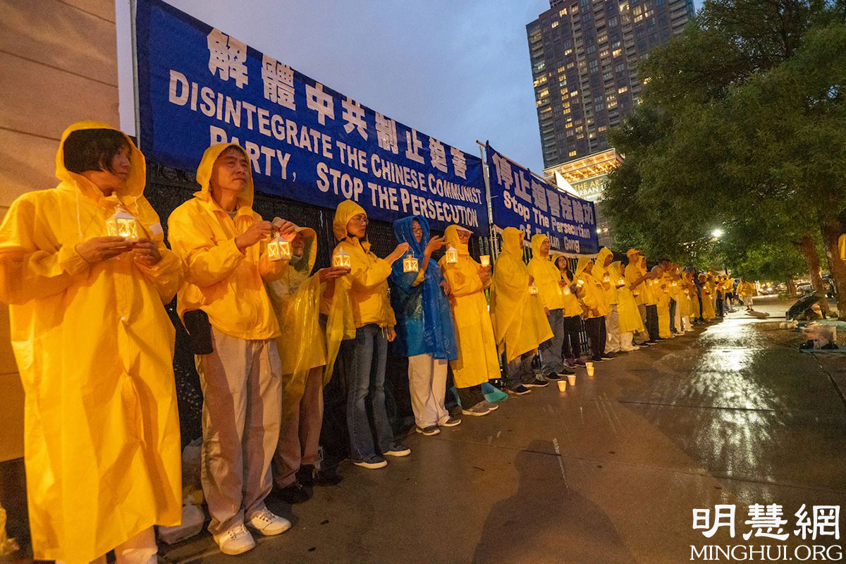 现场活动中,法轮功学员们打出“解体中共制止迫害”,“停止迫害法轮功”,“法轮功和平理性反迫害22周年”等中英文横幅,举行了集体炼功和烛光夜悼活动。