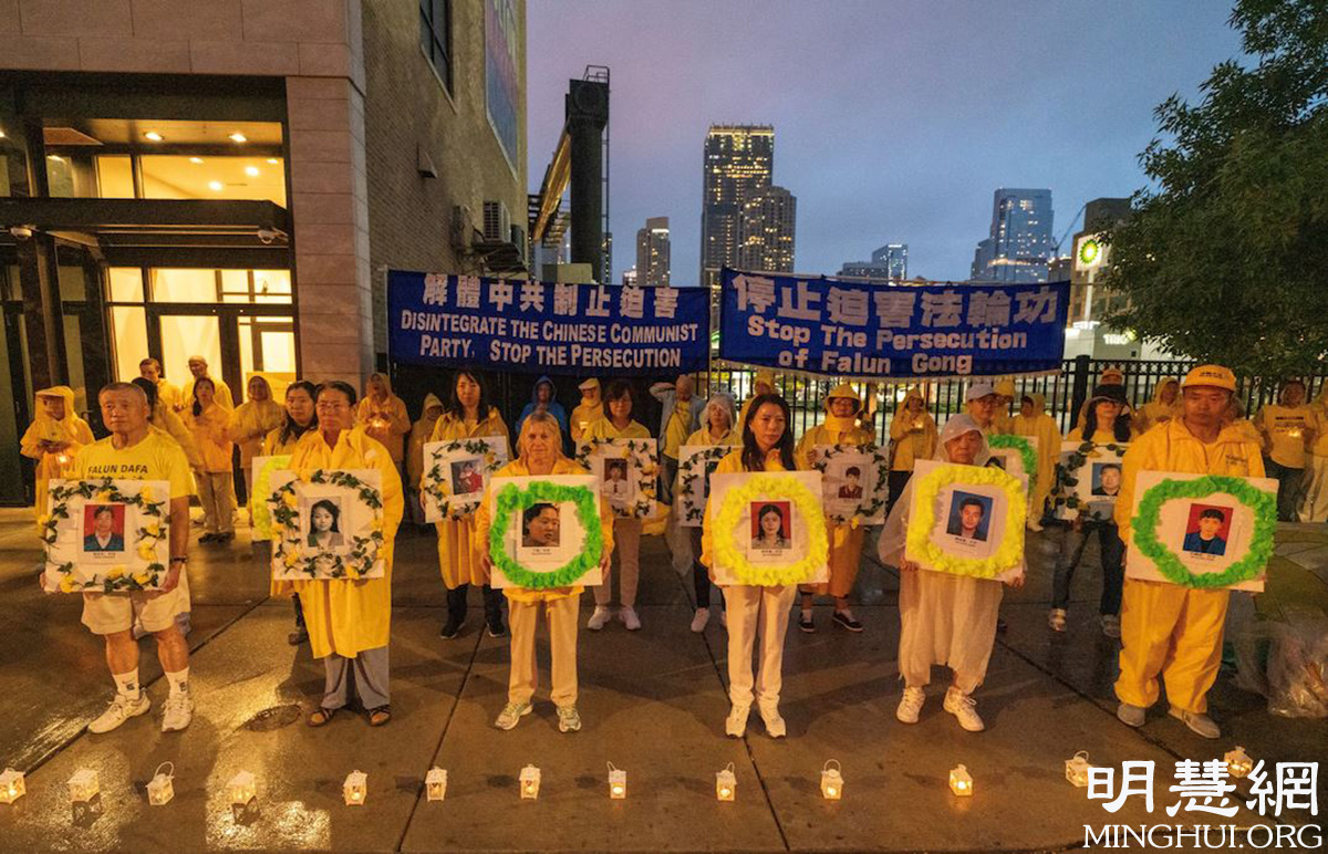 图2~3:部份芝加哥法轮功学员再中领馆前举行烛光夜悼活动