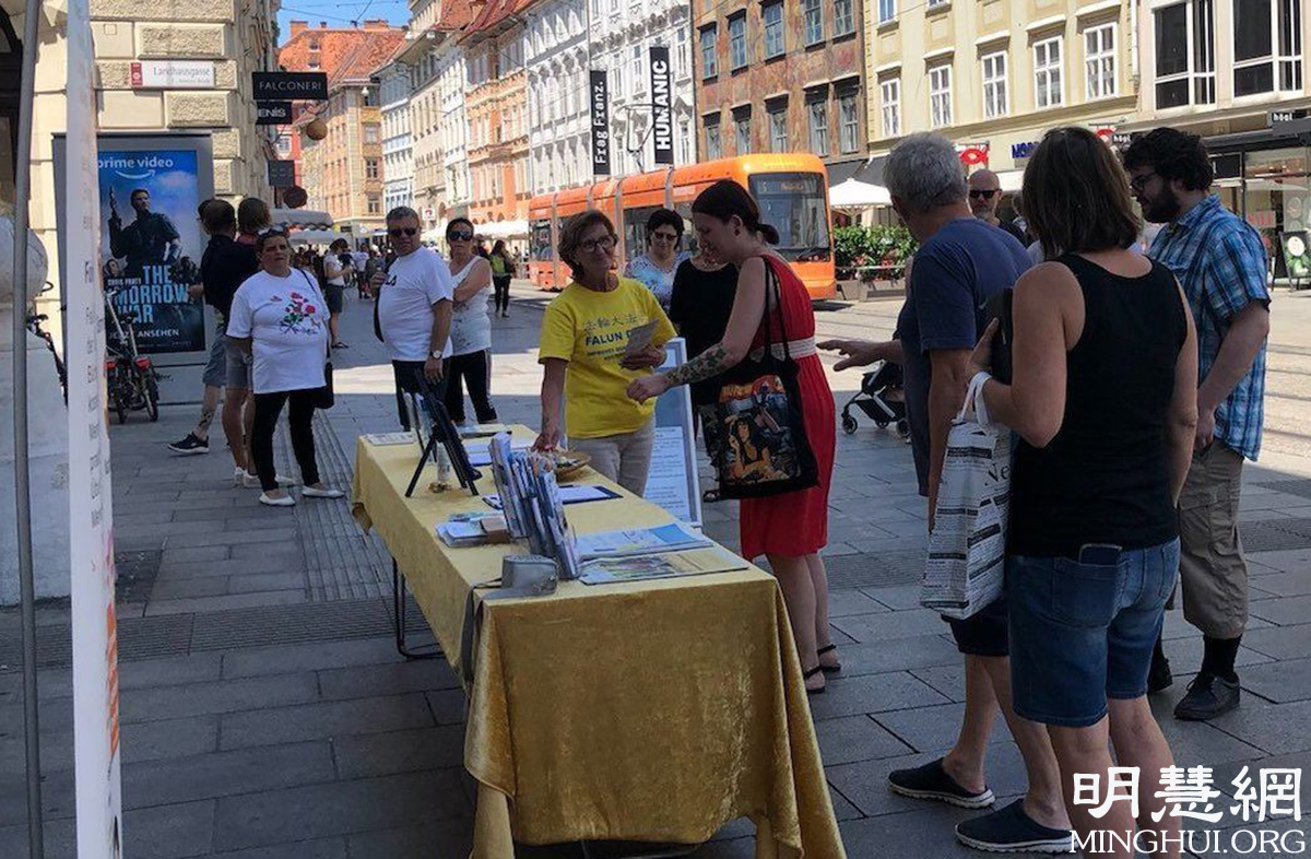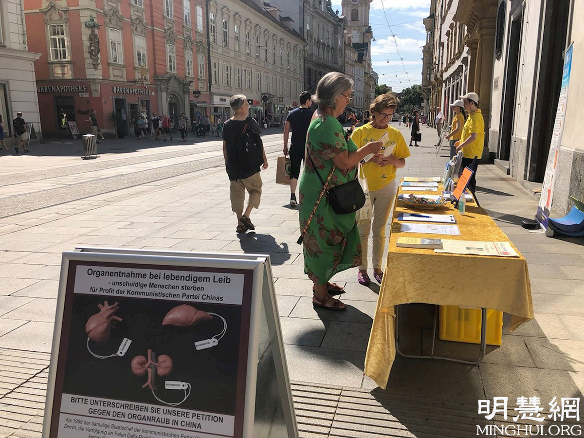 当天的讲真相活动现场,行人纷纷签字支持反活摘器官。征签后的请愿书会传达给奥地利政府。许多行人都觉得中共为了获利杀戮无辜的人用于器官移植是非常邪恶的罪行。