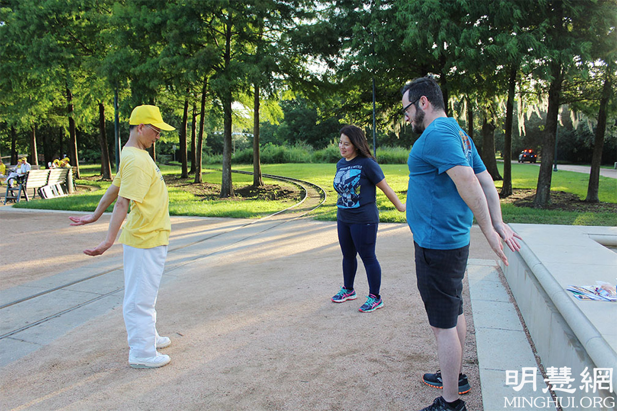最后,这对夫妻提出马上学功。学员王先生教了他们法轮功的动功。学功后,让内先生说:“感觉轻松,舒适,有能量,很好。”让内太太说:“感觉在清理身体,全身充满能量。”她还问:“每天炼功需要多少时间?”学员王先生告诉她可以根据自己的情况,王先生自己打坐一小时。让内太太听后说:“值得。”最后这对夫妇在手机上观览了falundafa.org网站。