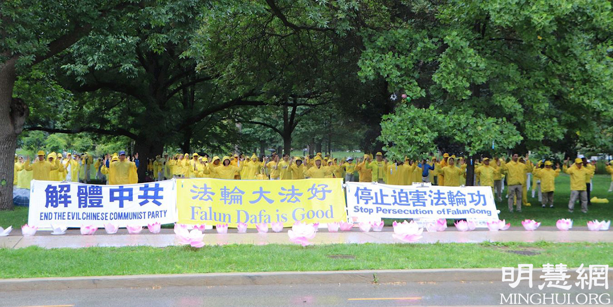 十七日的一早,学员们就已经冒雨到了公园集体炼功,中午十二点开始集会,一点开始游行,游行历时两个多小时。
