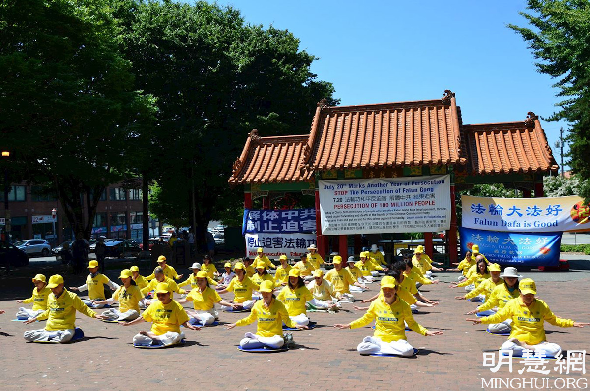 梅兰妮不久前才从密西根州搬到西雅图,她因爱吃中国菜所以就特地来中国城找正宗的中国餐馆,当她路过庆喜公园时被法轮功学员集体炼功的场面吸引,因此好奇地观看法轮功真相展板。