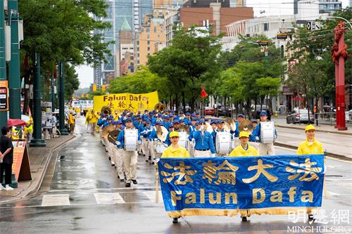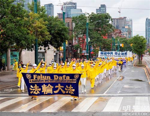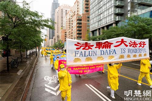 游行队伍从市中心的皇后公园出发,经Bay街,一直往南,经Queen街西行,贯穿中区唐人街的Spadina大道,历时两个多小时。天国乐团打头阵,跟着是“法轮大法好”方阵、停止迫害方阵和“九评”三退方阵等几大方阵。
