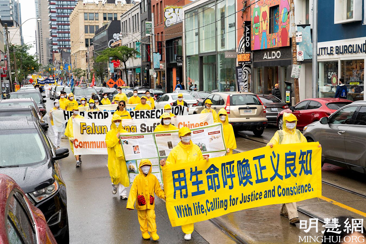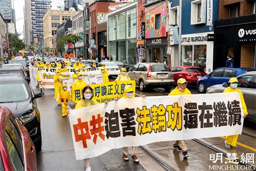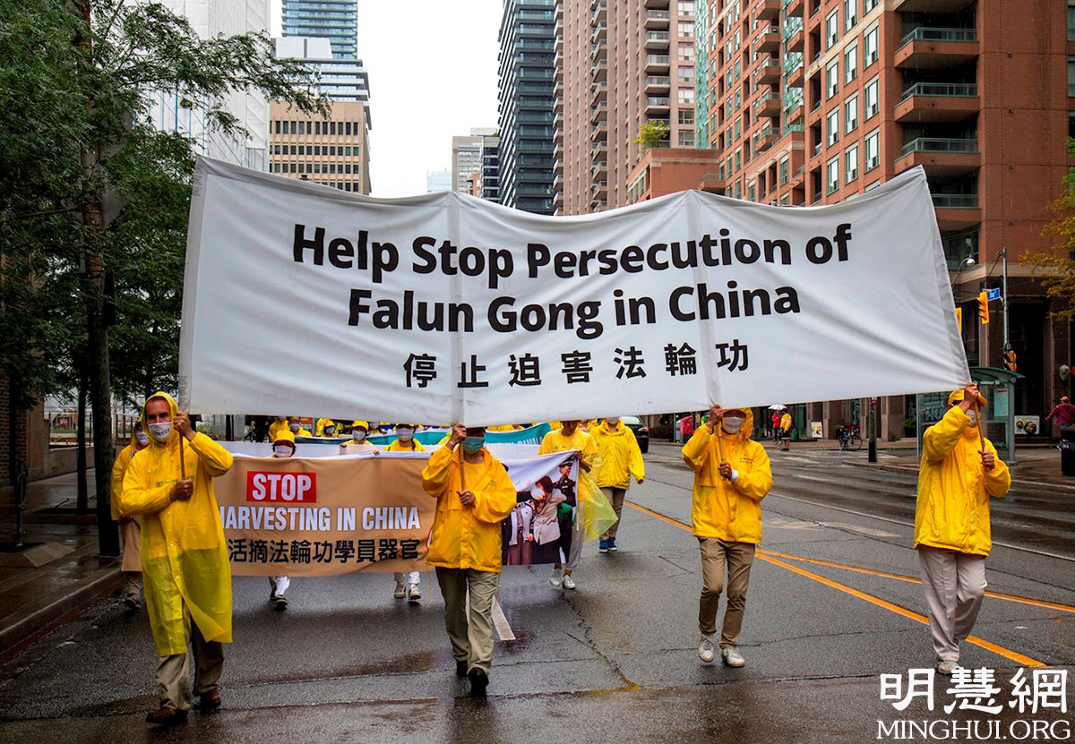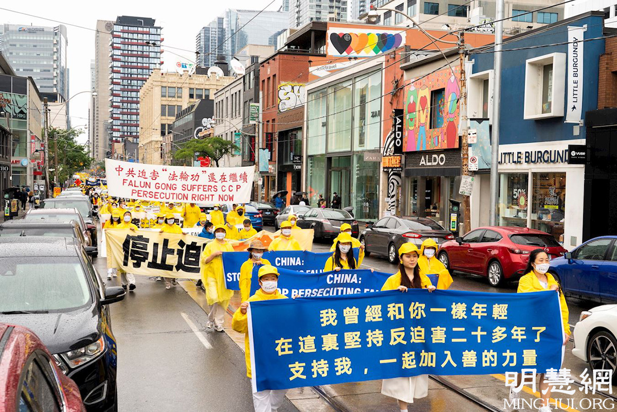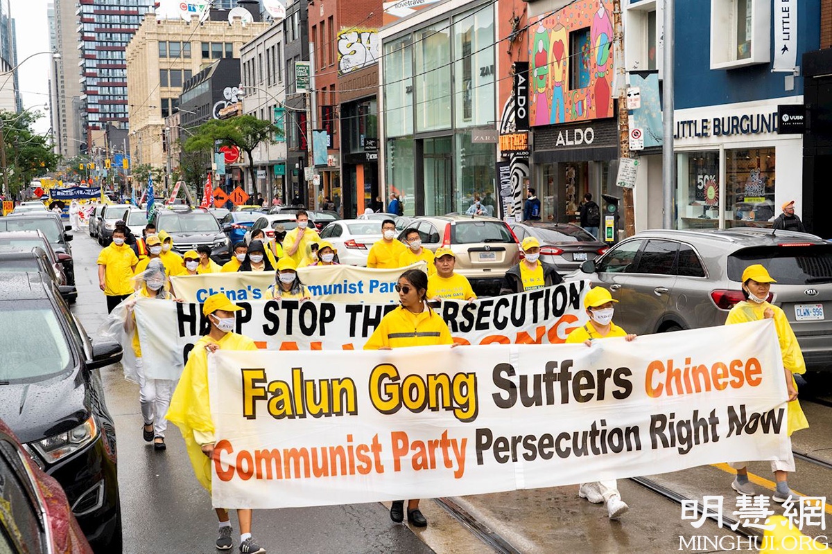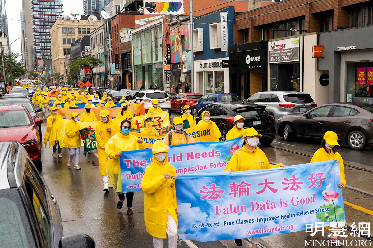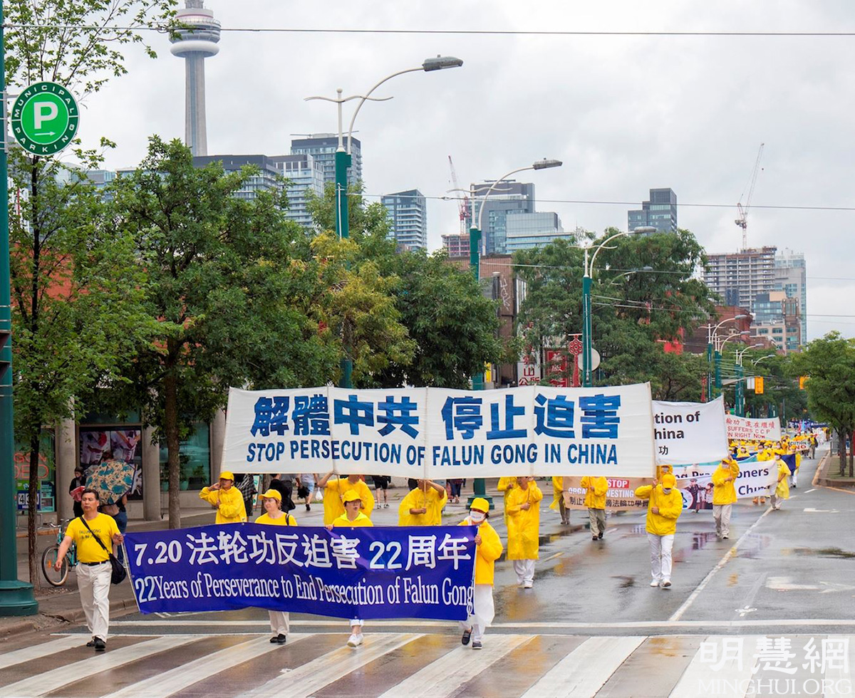 【明慧网二零二一年七月十九日】(明慧多伦多记者站报道)自二十二年前,中共开始对信仰真、善、忍的法轮功学员的残酷迫害,法轮功学员和平理性、从不放弃、从不妥协的抗争,让举世瞩目。在反迫害二十二周年之际,二零二一年七月十七日,加拿大多伦多法轮功学员在市中心举行了反迫害大游行,呼吁人们的正义和良知,呼吁共同解体中共,制止长达二十二年的迫害。有民众表示是时候结束中共、停止迫害法轮功了。