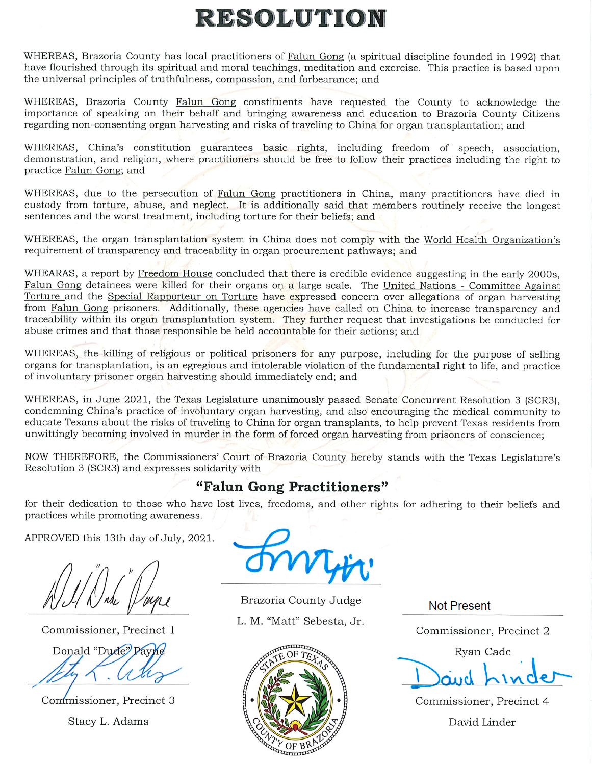 • 休士顿布拉索内亚郡通过决议案 声援法轮功学员