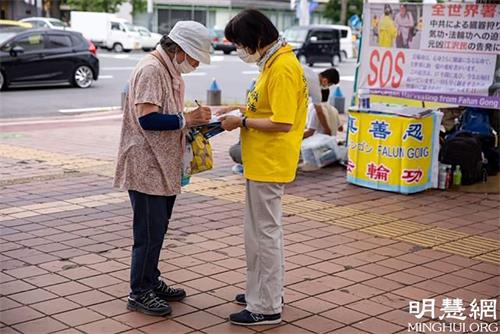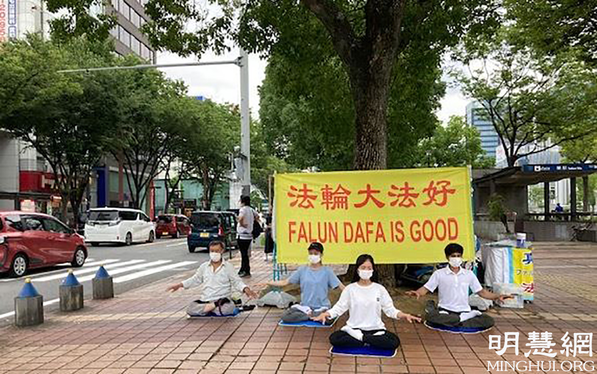 六月二十日,名古屋刚刚被解除了疫情的紧急状态。二十七日当天,街上人来人往,人们三三两两的逛街,还有家长带着小孩儿的也不少。法轮功学员们在荣的喷水池附近炼功,向过往行人发送有关法轮功与疫情的真相资料,并为声援全球诉江而征集签名。活动期间,法轮功学员们打出写有“法轮大法好”、“法轮大法洪传全世界”、“SOS停止迫害法轮功”及“声援全球诉江签名 中共停止活摘器官”等内容的中英日文横幅。