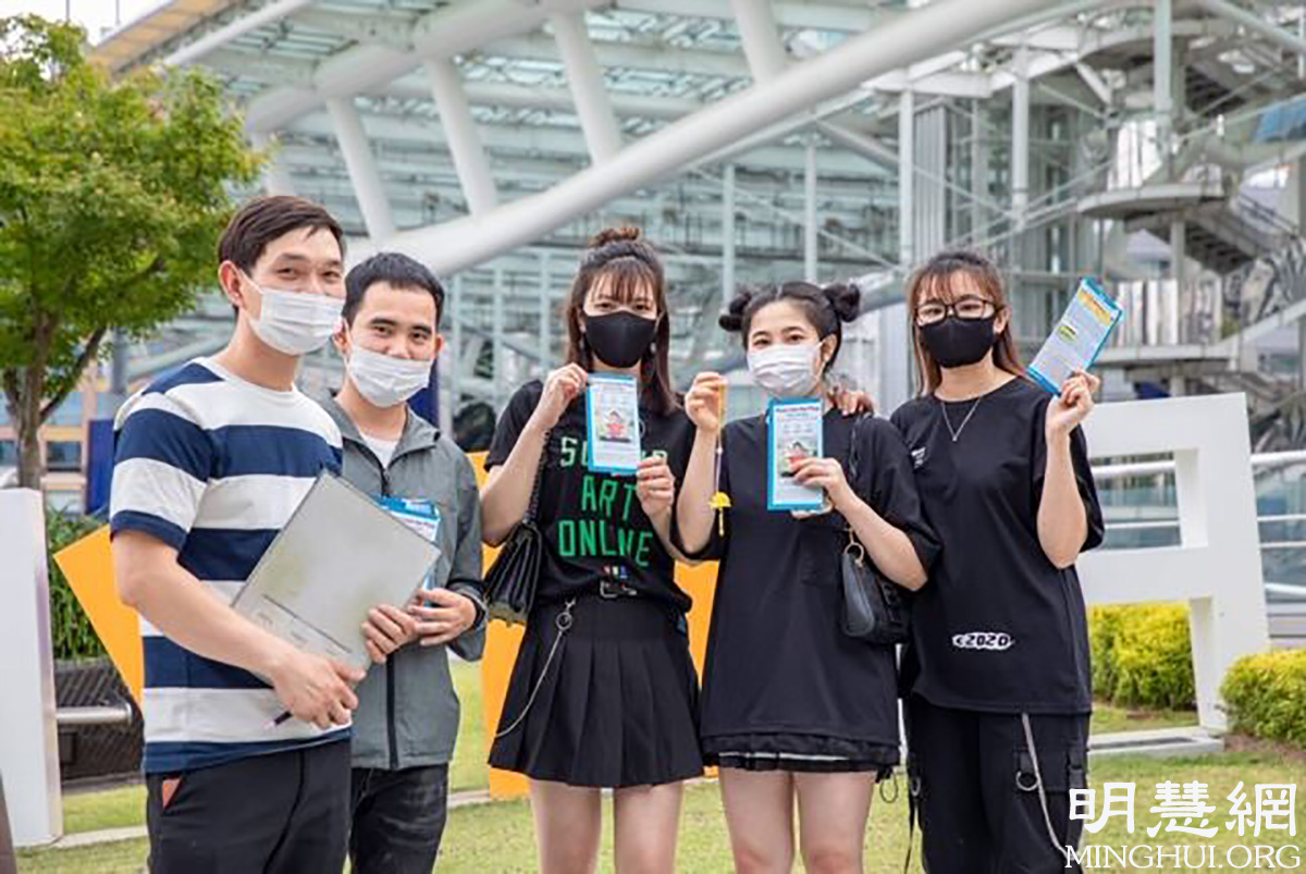 去年中共病毒爆发、蔓延全球,使越来越多的日本人看清了中共掩盖疫情、欺骗世界的真面目。活动当天,有很多过往行人在听了大法弟子们的讲真相后,马上在诉江纸上签名。其中有一位看起来七十多岁的老先生,在签名后法轮功学员送给他一个写有“法轮大法好”、“真善忍”的小莲花,他非常高兴地收下了,并立即挂在了自己的包上。他还让学员看他挎在身上的小包,原来他的小包上已经系着一个小莲花,他笑着说是以前路过时法轮功学员送给他的,他一直都把那个小莲花当作自己的护身符。还有三个高中生男孩,休息逛街,在听了法轮功学员讲的真相后,毫不犹豫地都签了名。