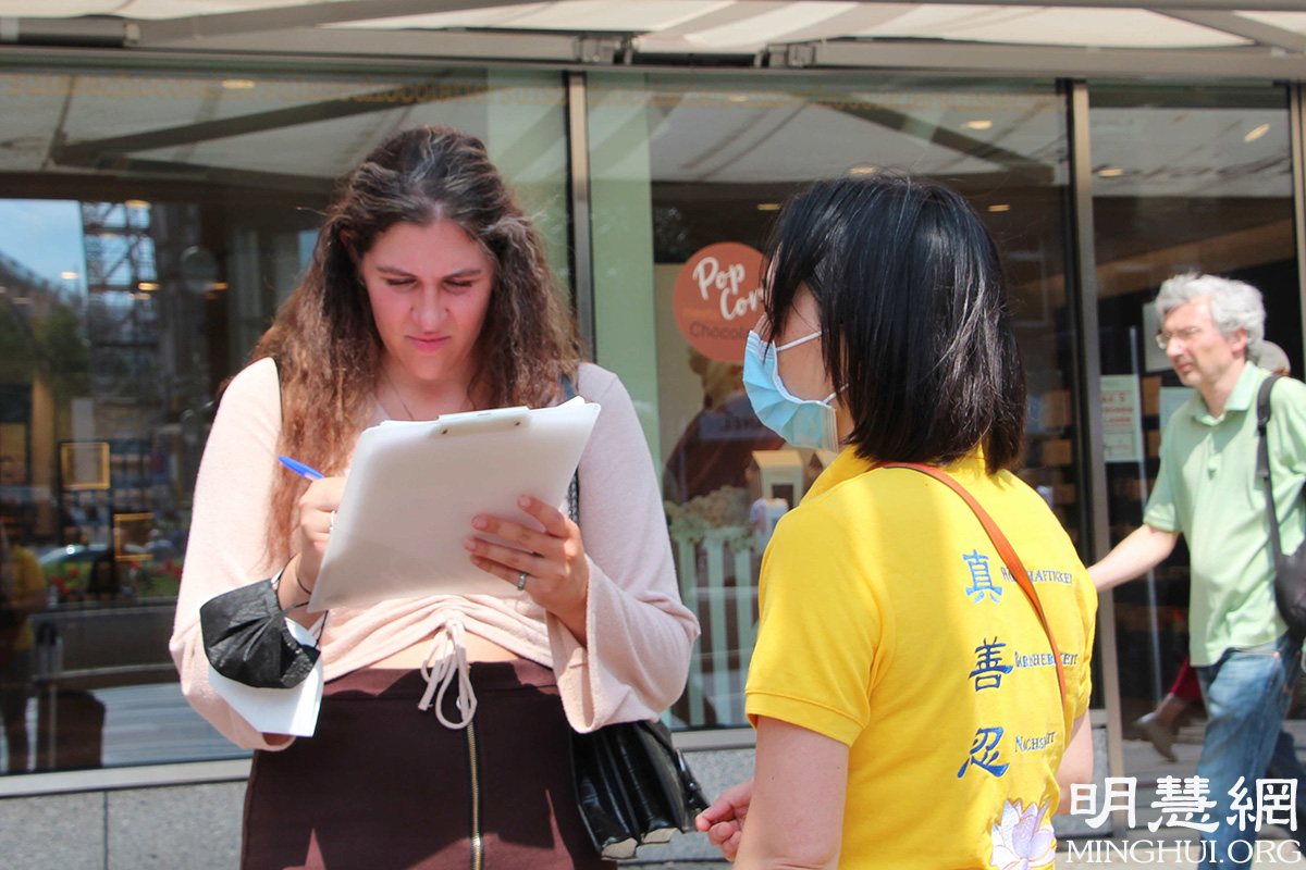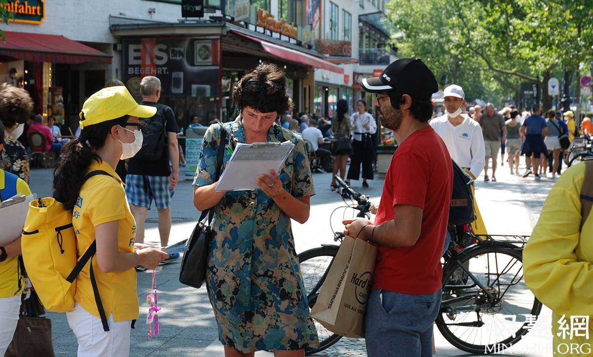 随后她来到维滕贝格广场(Wittenbergplatz)的信息摊位,签名支持法轮功学员。谈及中共对法轮功的迫害,她认为:“这无法容忍,这样的迫害(法轮功)根本就不该发生,无论在哪,这样的迫害不该存在。这完全违背了人权,根本就不该发生。”一直以来她非常关注在中(共)国的人权问题,她认为一直以来因为经济的原因,让中(共)国的很多人权问题被忽视。但她认为和中国(共)做生意的政府有责任关注在中国的人权。她认为:“越来越多的这样(法轮功学员)的活动能够让更多人来关注人权,或者找到其他的解决方法。”
