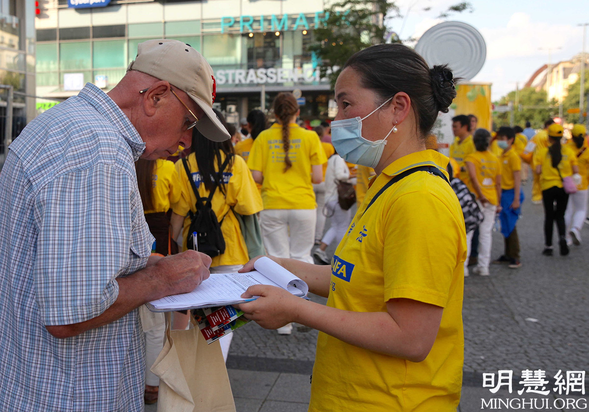 不仅仅是帕兹,还有众多路人看到了法轮功学员在柏林市中心及著名景点的反迫害二十二周年游行。十七日下午的游行在选帝侯大道上(Kurfuerstendamm),在这条相当于柏林的香榭丽舍大道,游行队伍途径众多的名牌商家及著名景点威廉皇帝纪念教堂(Kaiser-Wilhelm-Gedaechtniskirche),并在维滕贝格广场(Wittenbergplatz)设立信息摊位,让人了解更多的讯息。傍晚的游行在柏林最大的零售中心,西南区的城堡街(Schlosstrasse)上。