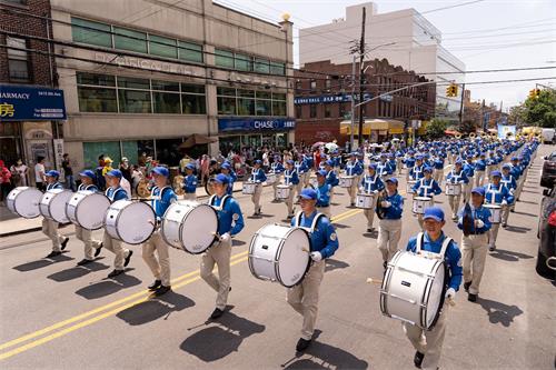 第一方阵“法轮大法好”。打头阵的天国乐团为布鲁克林的民众演奏了“法轮大法好”、“送宝”、“凯旋”等曲目,嘹亮乐音贯穿八大道的大街小巷。讲述大法美好的巨型竖幅、各式横幅在阳光下非常的醒目亮眼。 “九字真言避大难、退出中共保平安”的巨型竖幅和“瘟疫面前保命良方,诚念法轮大法好,真善忍好”的大型横幅,传递着天机,希望世人能够平安渡过劫难。