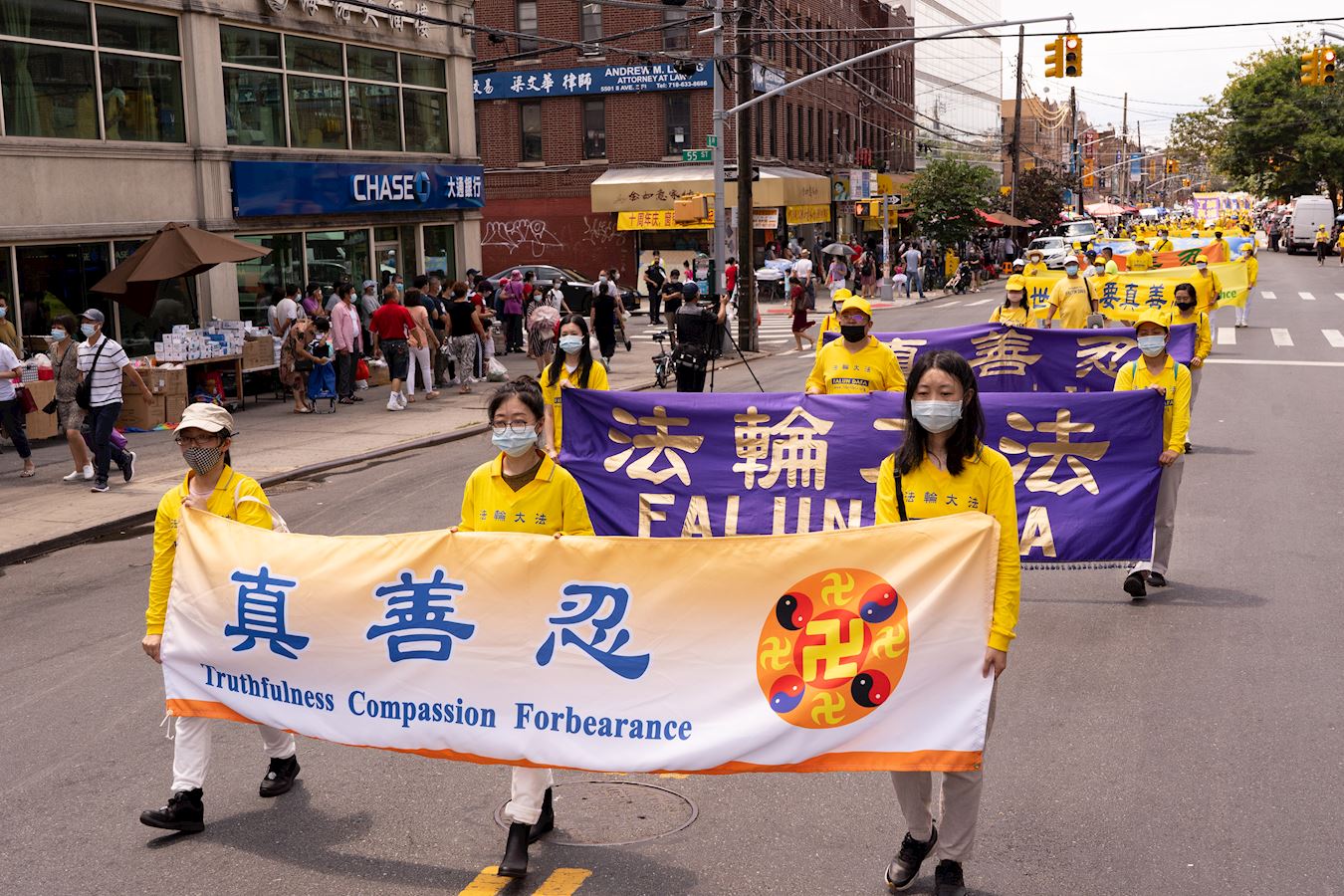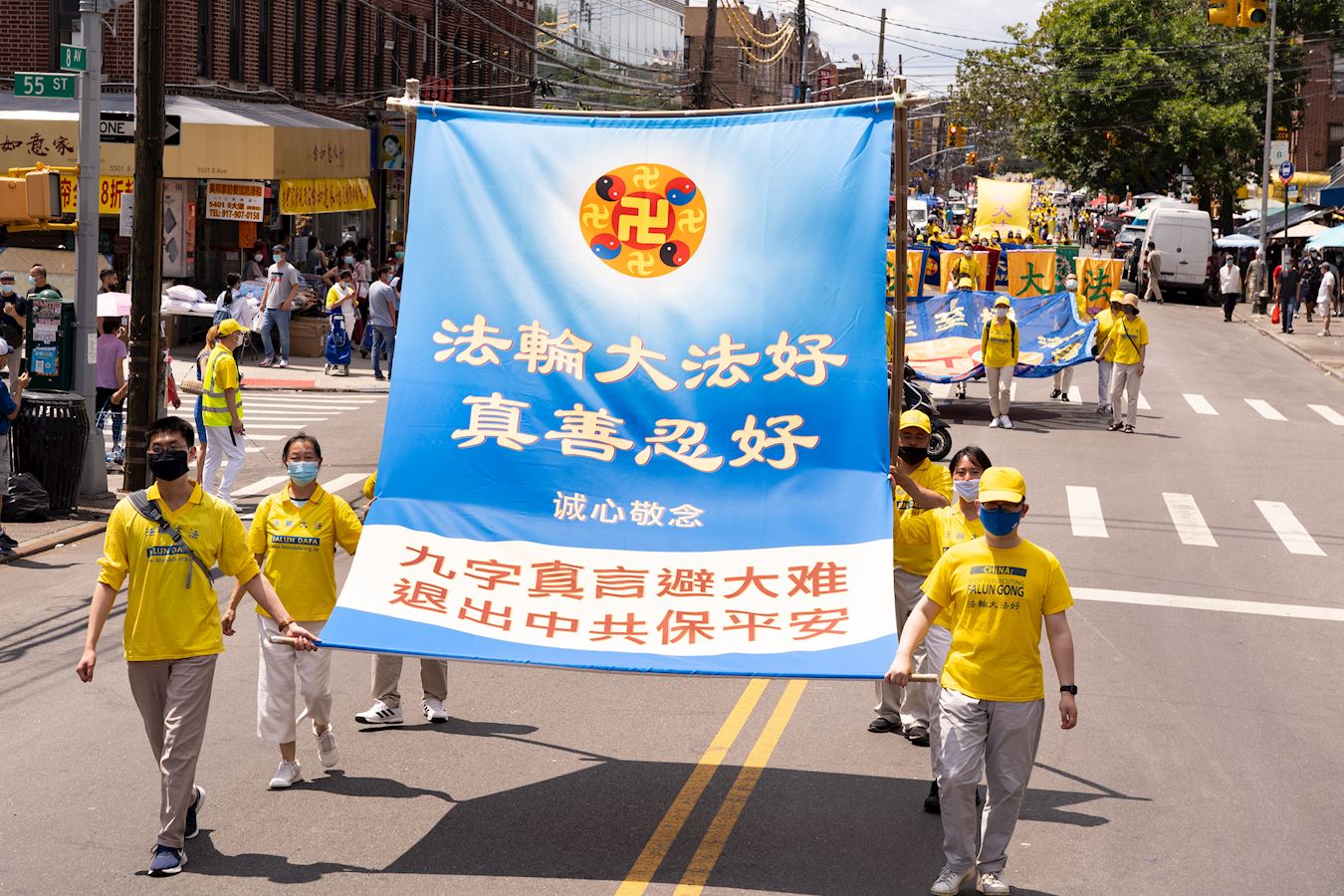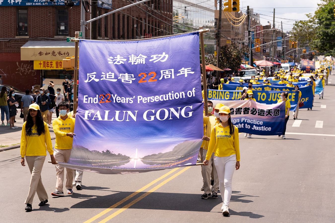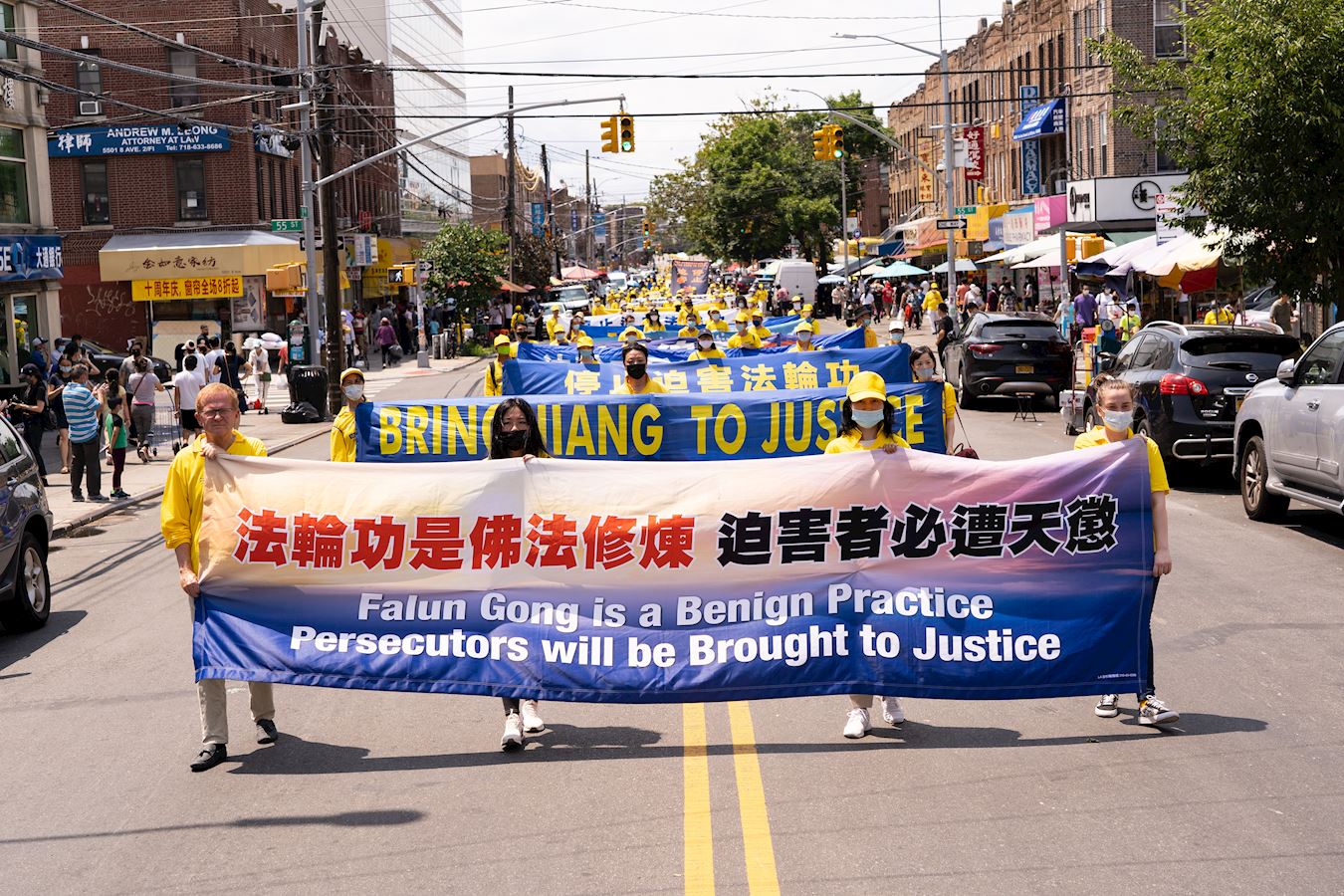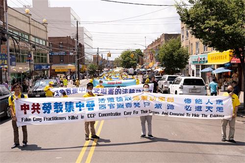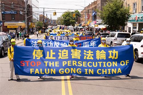 【明慧网二零二一年七月二十日】今年是法轮功反迫害二十二周年,二零二一年七月十八日,纽约地区部份法轮功学员近千人在纽约的第三大华人社区——布鲁克林(又称布碌仑)第八大道游行,希望世人赶紧了解真相,同时呼吁曾加入中共党团队组织的中国人三退保平安。