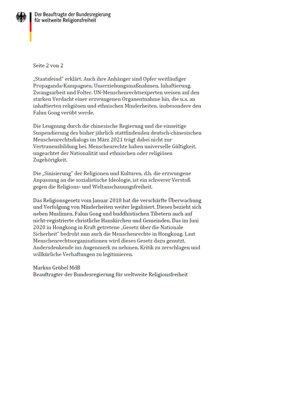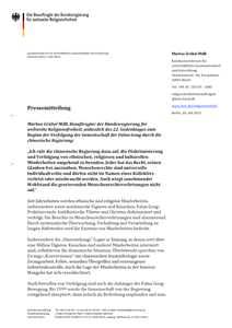 公告指出,中国政府(中共)的否认,以及在二零二一年三月单方面中止一年一度的德中人权对话,无助于建立信任。人权具有无所不包的效力,不分国籍、种族或宗教信仰。宗教和文化的“中国(中共)化”,即强制适应社会主义意识形态,是对宗教和信仰自由的严重侵犯。