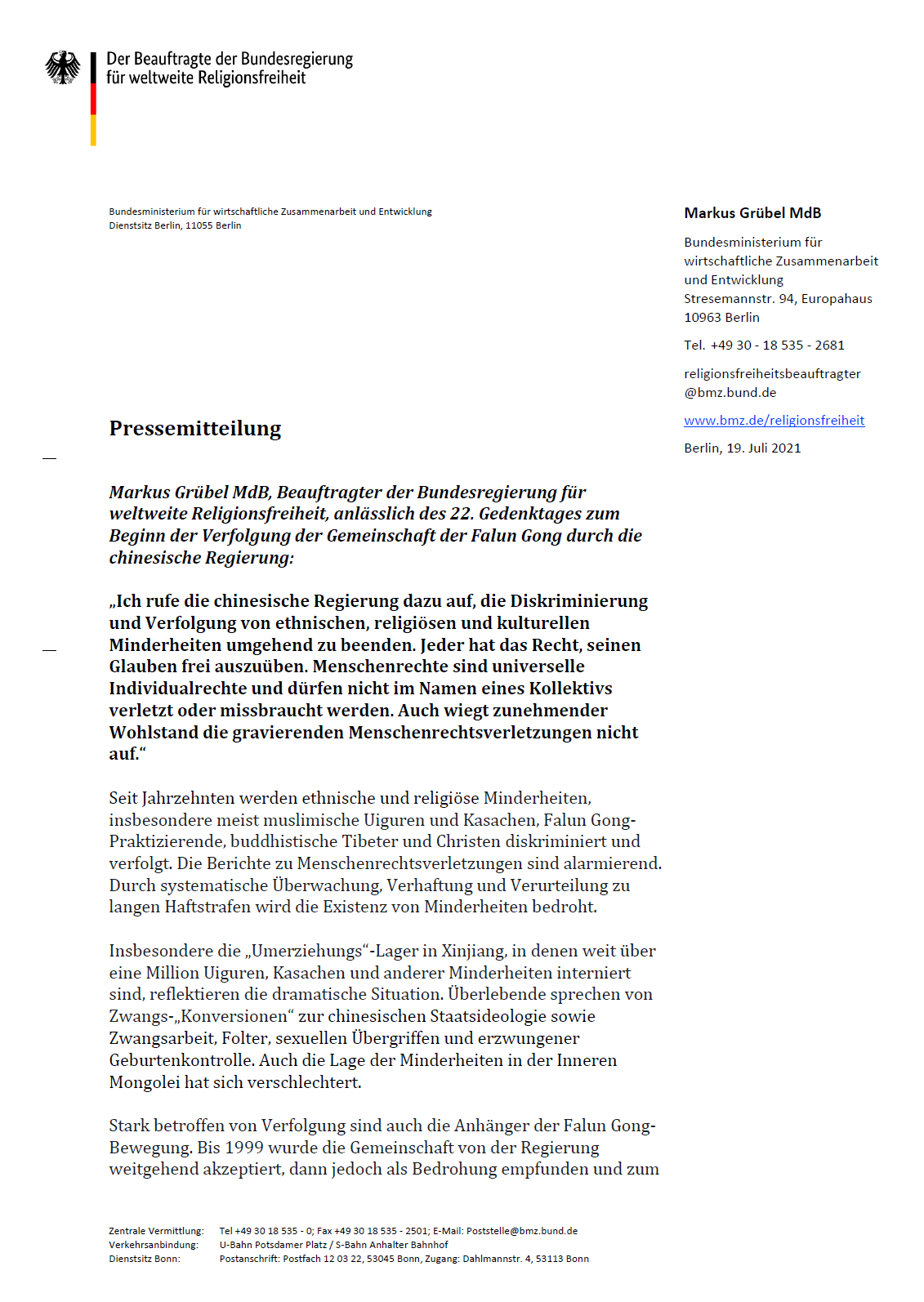 国会议员格鲁伯隶属执政党基民盟(CDU),同时也是德国联邦政府世界宗教自由专员。格鲁伯选择了七月十九日以政府名义发布新闻公告,这一日子是法轮功二十二年前遭受中共全面迫害以及反迫害开始的前一天。