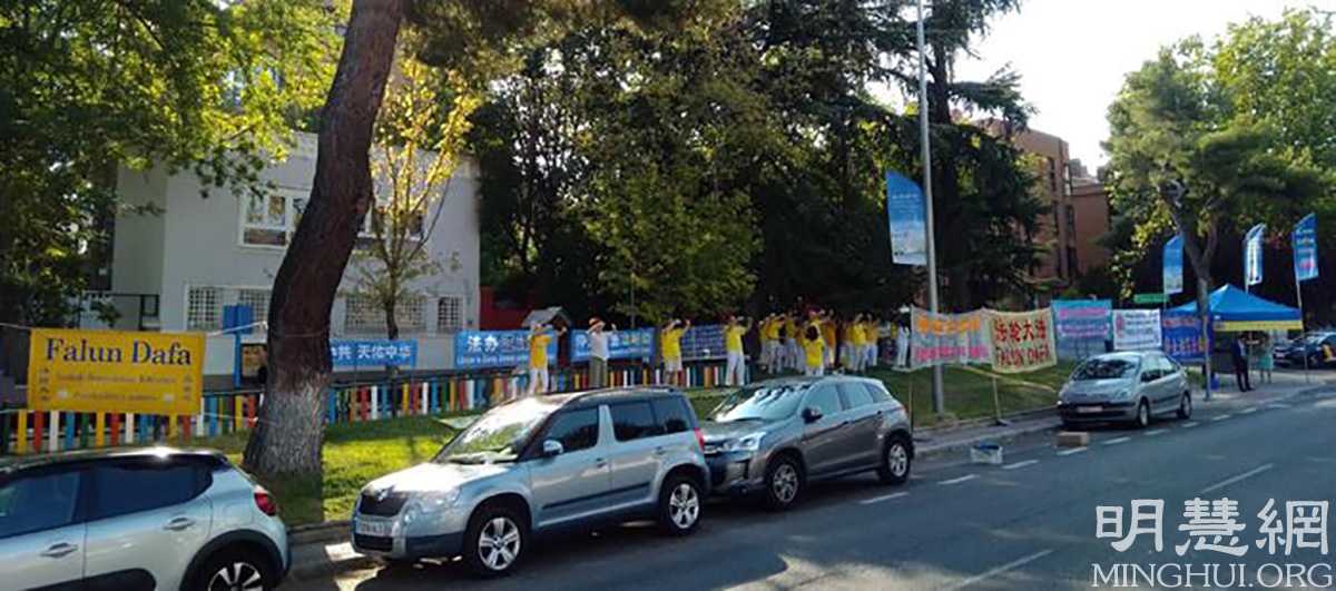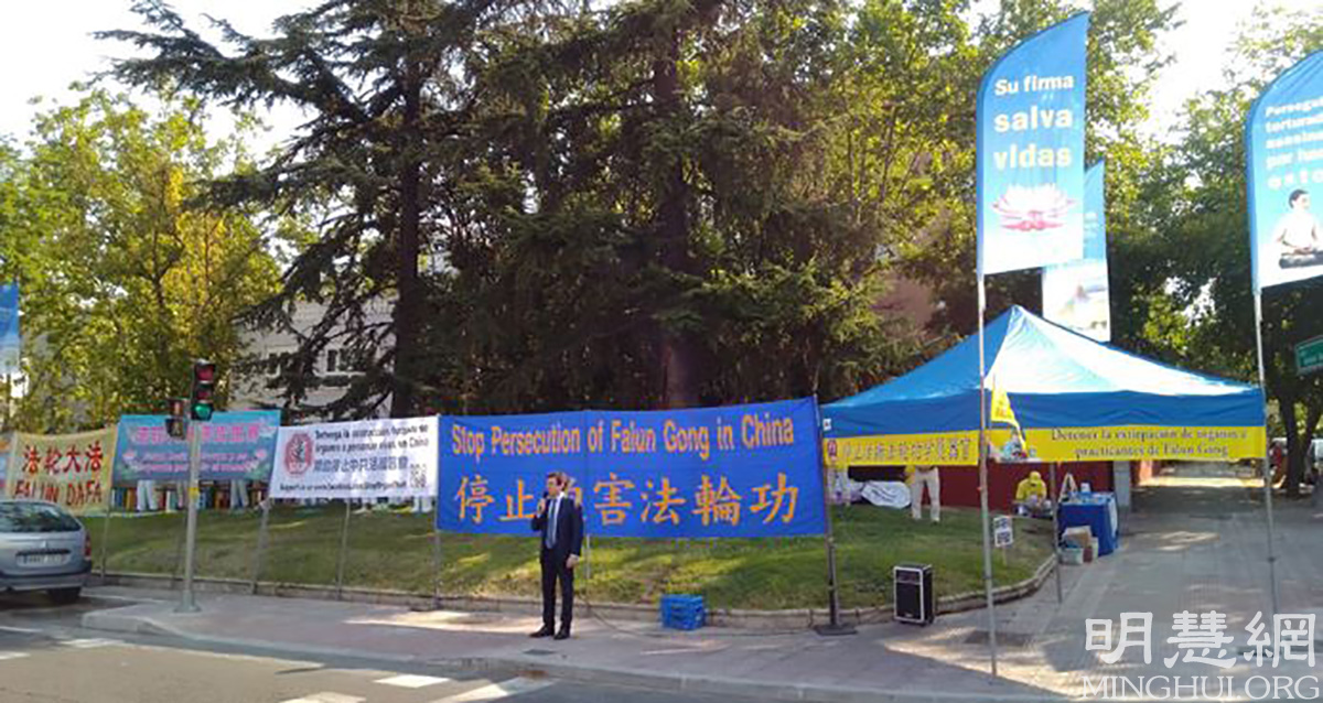 七月的西班牙炎阳炙人,七月二十日上午,一面面真相横幅和展板挂满了中使馆对面的长街,又正好是个红绿灯口,来来往往的车辆经过这里都不自觉地放慢了车速看横幅上的内容,学员等红灯车停的时候就给司机们递上真相传单。
