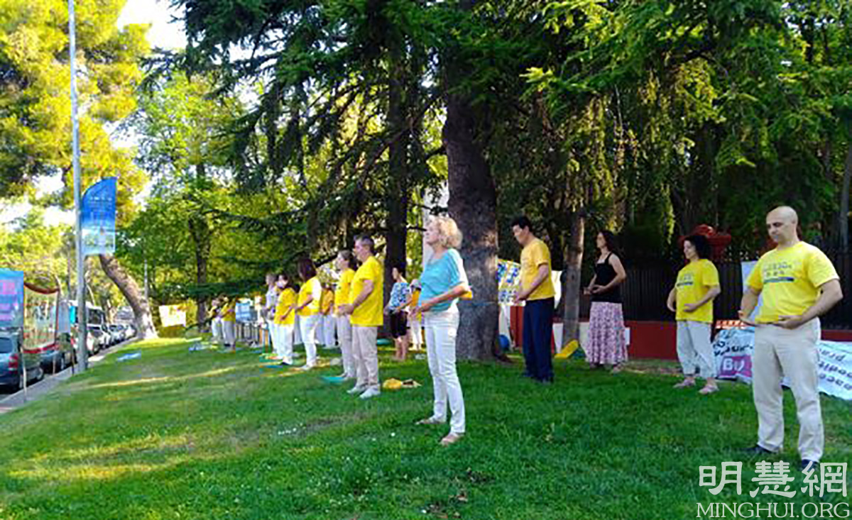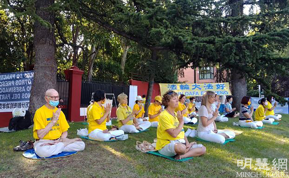 ![]() 图6:西班牙法轮功学员在中使馆前发正念 |