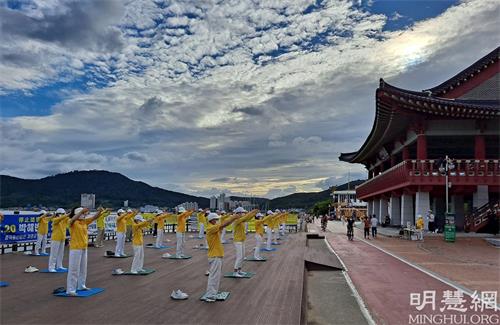 下午五时三十分,学员们以美丽的大海为背景修炼法轮大法的景象,引起了参观镇海楼的许多市民的注意。虽然天气预报有雨,但镇海楼天空晴朗,天空与大海融为一体,非常的美丽。