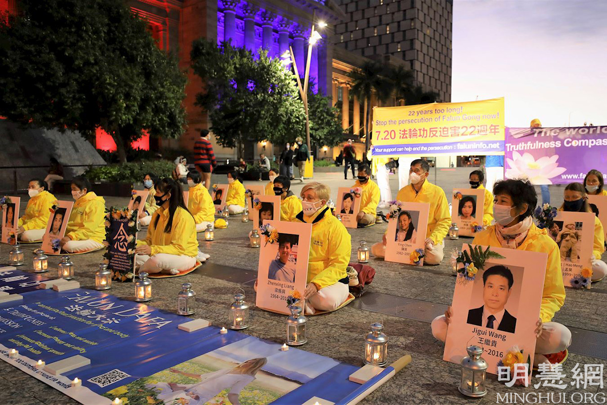 图1~2:七月二十日傍晚,法轮功学员在乔治国王广场(King George Square)举行纪念法轮功反对中共迫害二十二周年烛光夜悼活动。